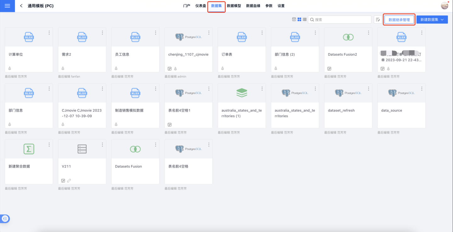 - 继承数据集不支持复制、删除、重命名、替换数据集、编辑数据集。