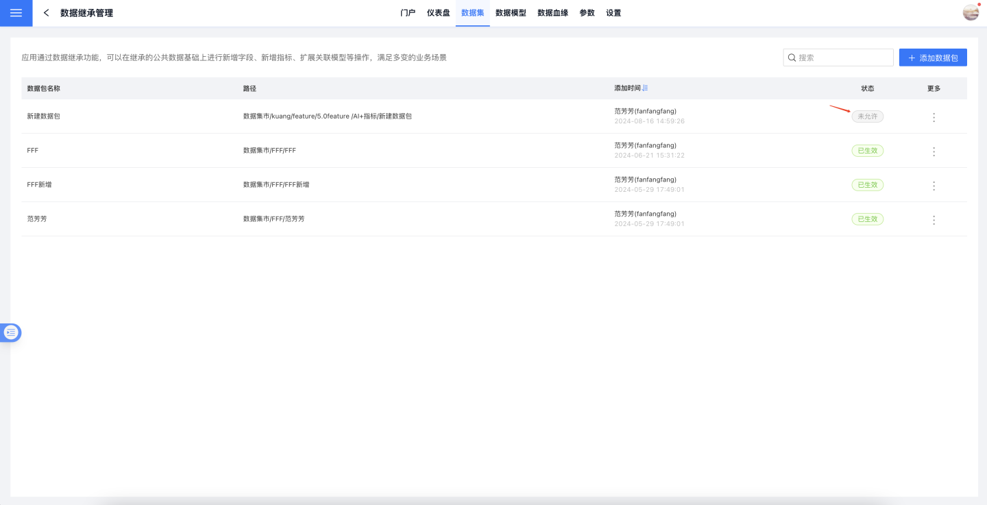 数据包管理者审批后,状态变为已生效。 申请者在数据集中可以查看到继承数据集。继承数据集带有标识,鼠标 hover 时会显示其来源的父级数据包。