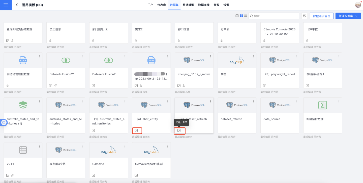 当不需要继承数据包时,可以在应用->数据集->数据继承管理中移除数据包。 由继承数据集制作的图表、派生的数据集、参数、新建字段等都不可用。