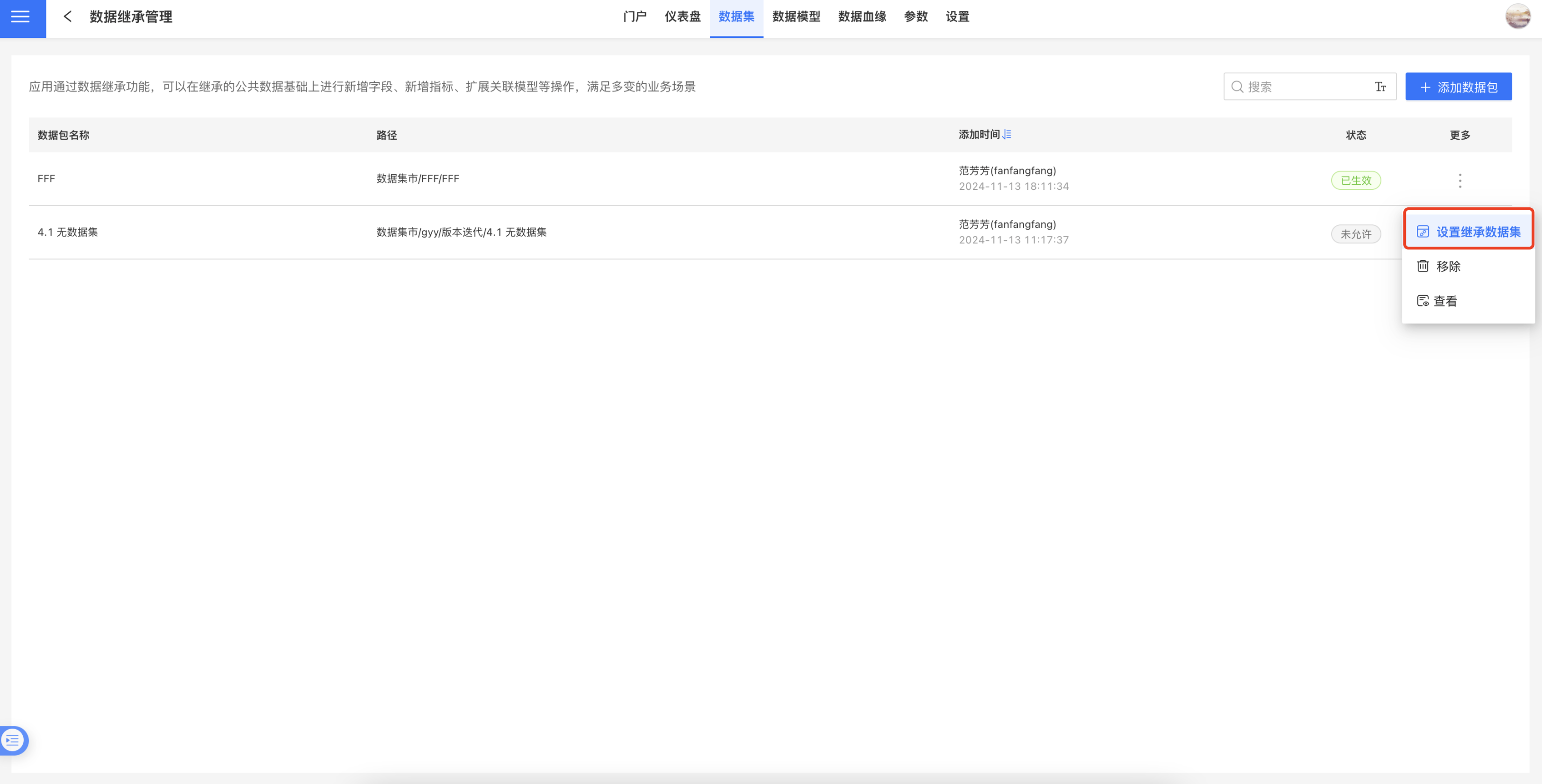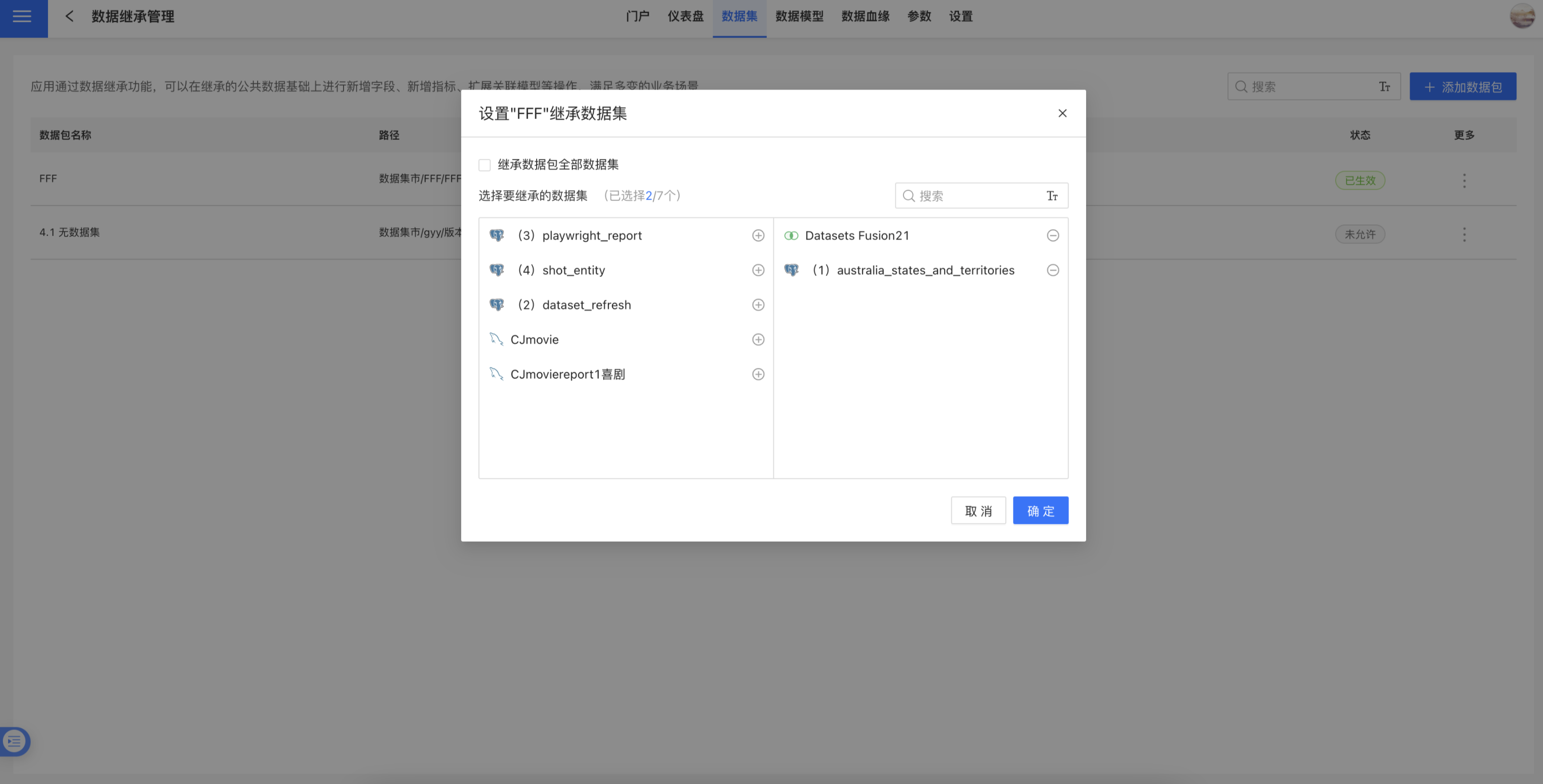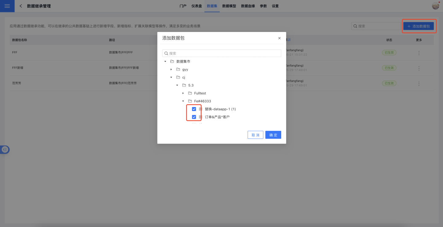 在应用->数据集->数据继承管理中添加数据包,选择数据集市中需要继承的数据包。