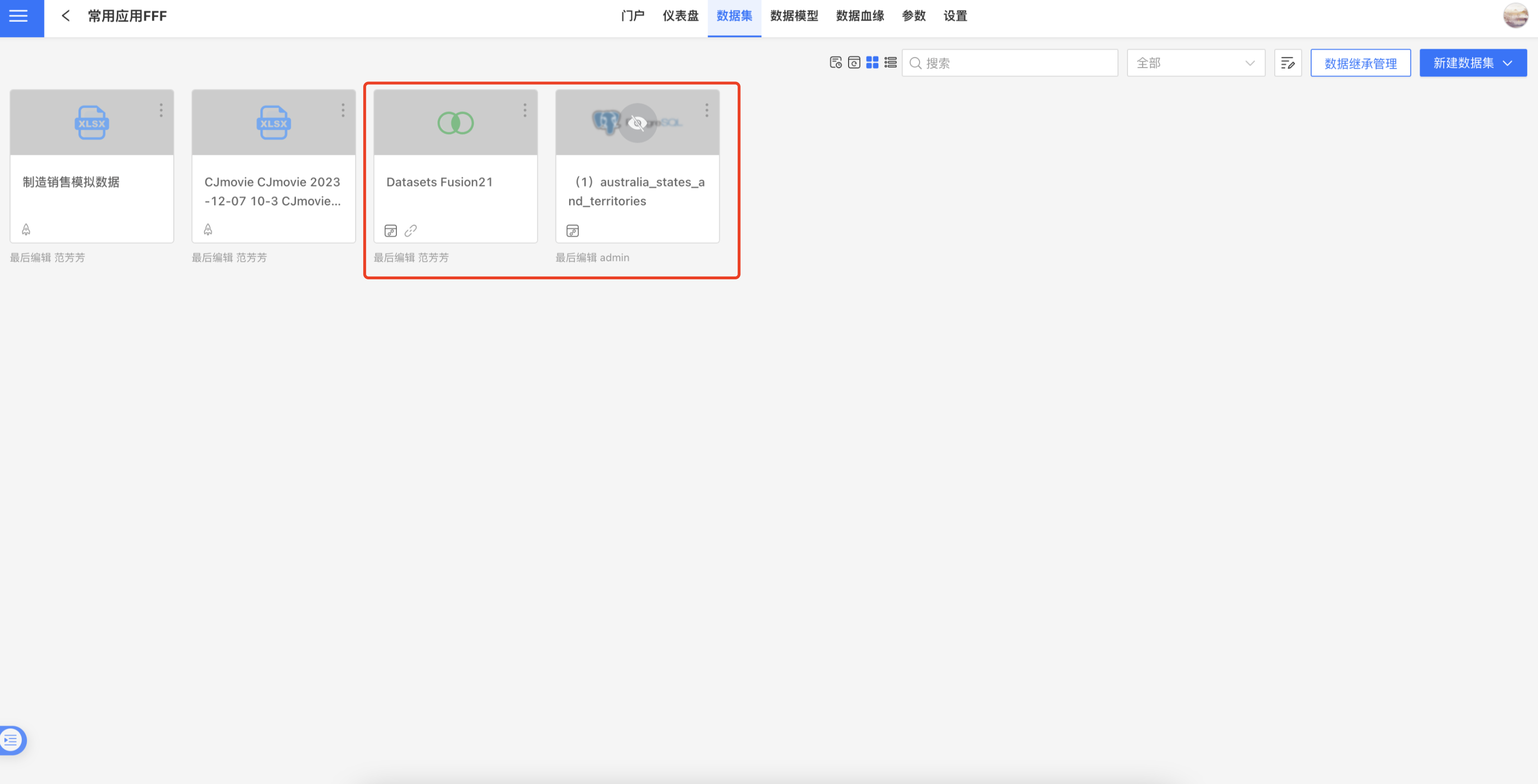 - 继承数据是继承了一个数据包中所有的数据,包括数据集、参数、数据模型,不能只继承某一个数据集。