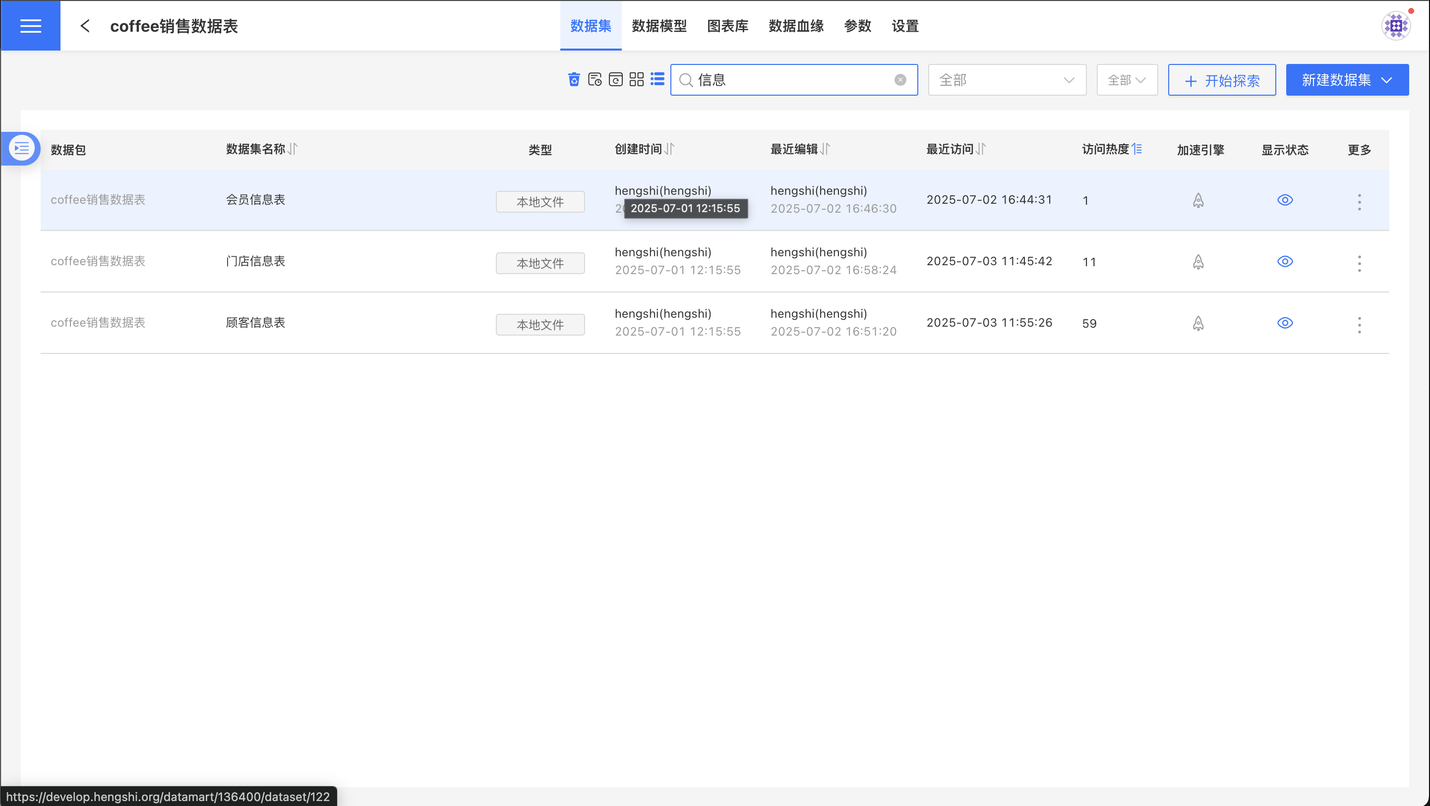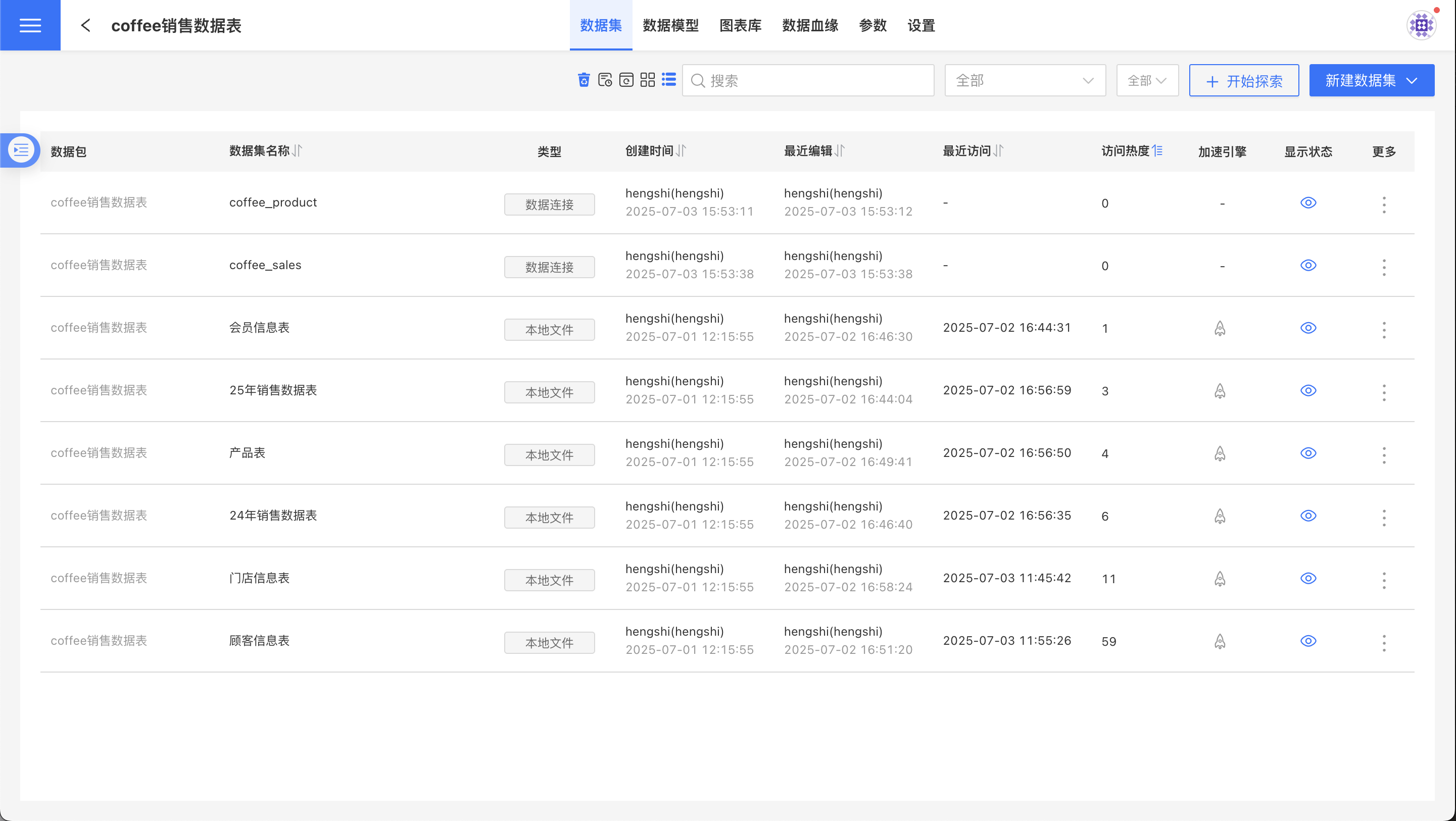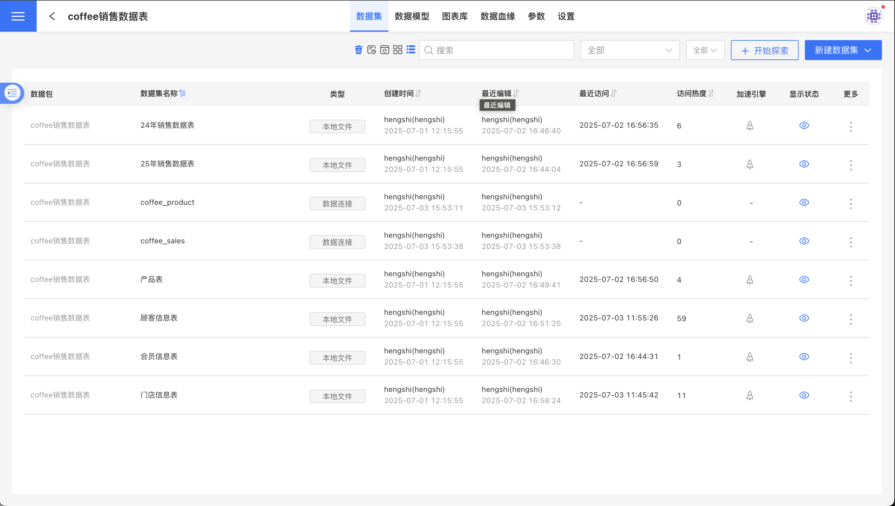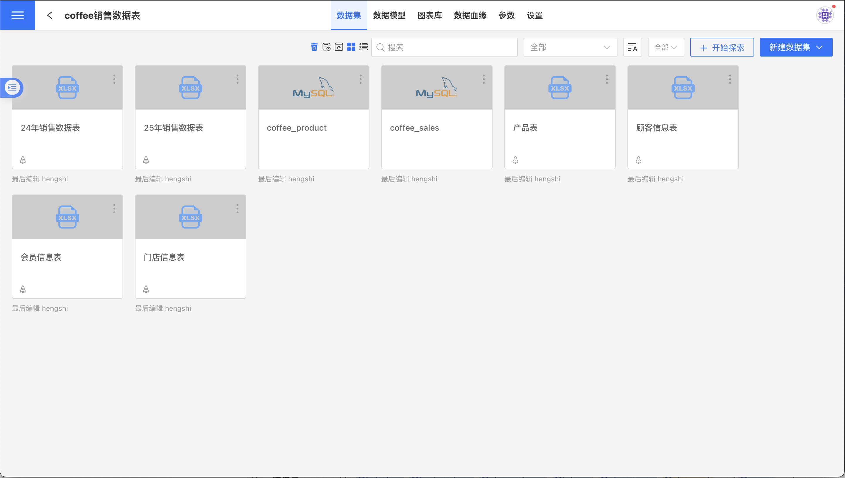 - 数据集类型:文字表明这个数据集的来源:数据连接、本地文件、SQL 查询等,图标表明这个数据集的存储类型