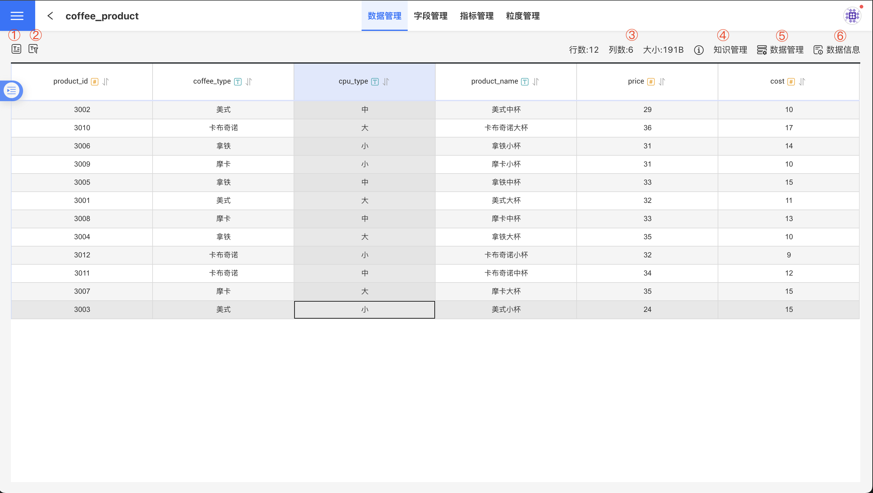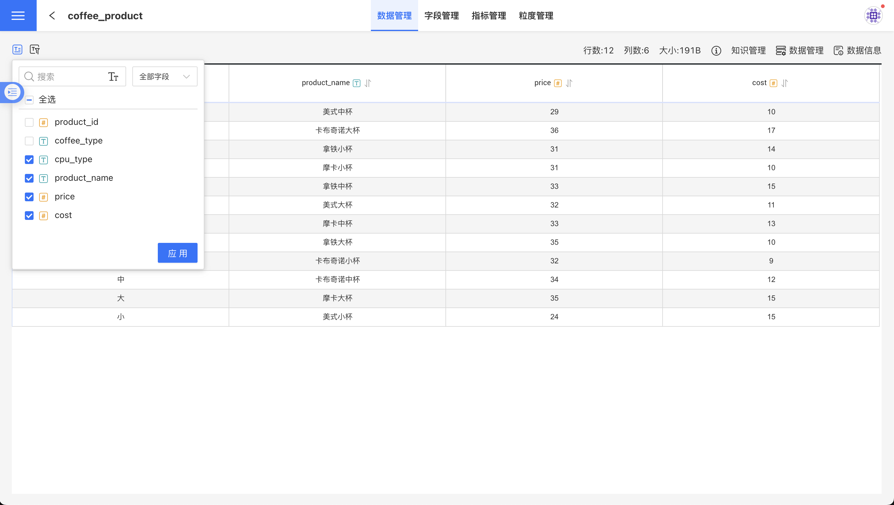 对应数据管理界面的①图标。点击字段选择图标,弹出字段选择列表,选择用户关心的字段,然后点击应用,数据集页面就会显示所选字段的数据。