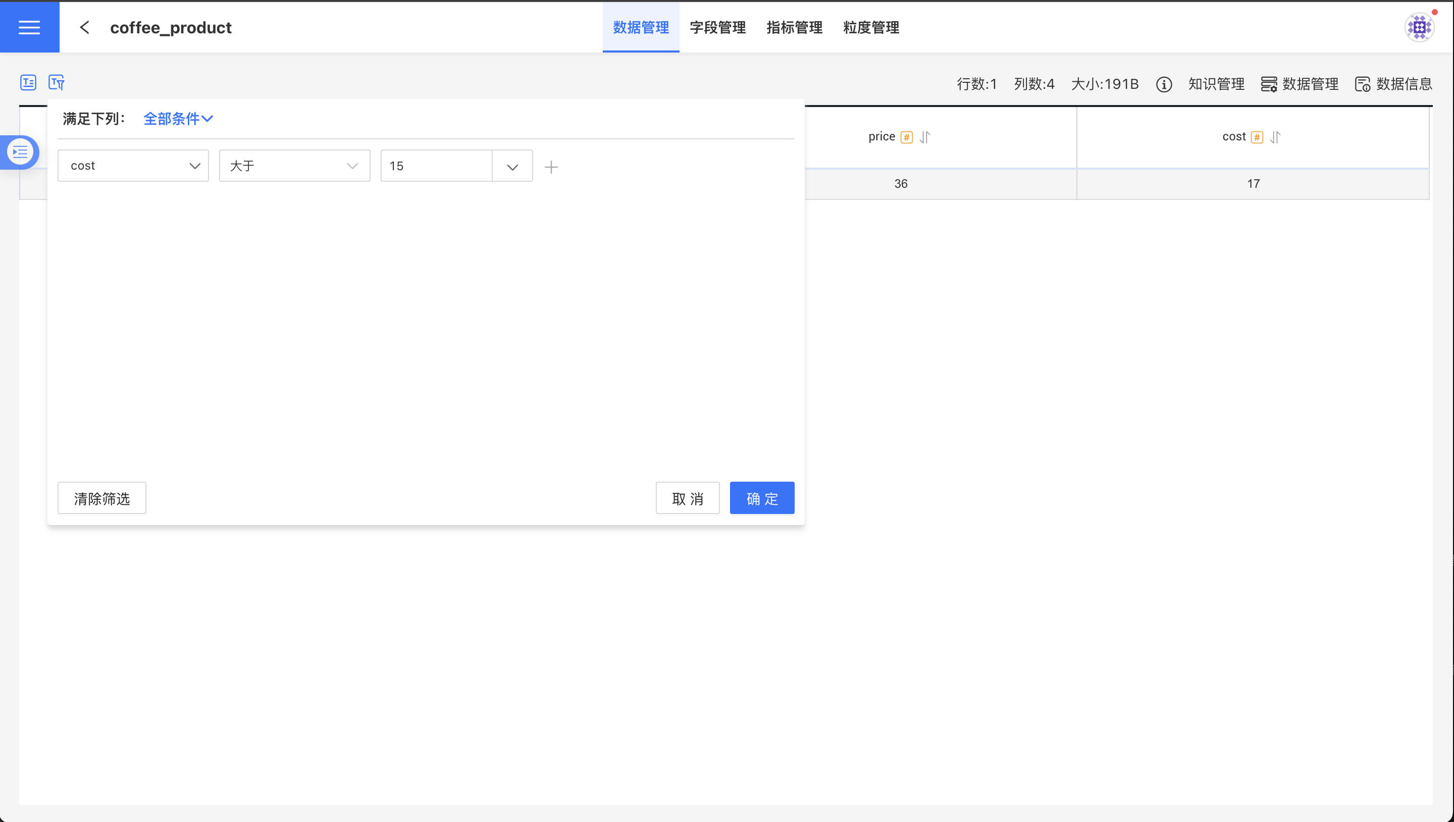 对应数据管理界面的②图标。点击筛选数据图标,弹出数据筛选弹窗,在弹窗中添加筛选条件,然后点击确定,数据集页面会显示筛选过后的数据。