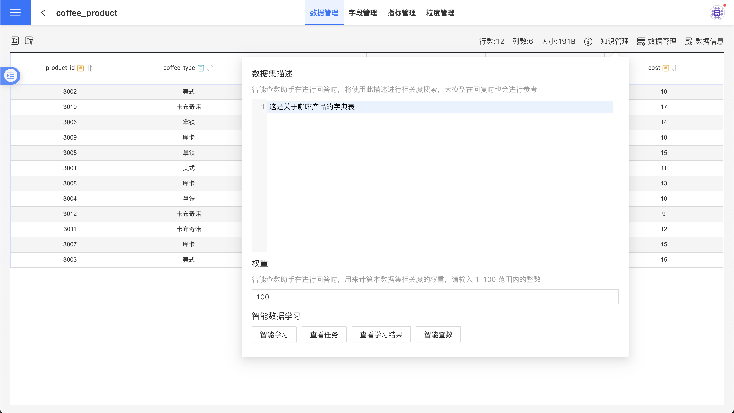 对应数据管理界面的④图标。知识管理是为了在AI分析中提高使用数据集的准确度,它包含下面的功能: 1. 编辑数据集描述,智能查数助手在进行回答时,将使用此描述进行相关度搜索,大模型在回复时也会进行参考。 1. 编辑权重,智能查数助手在进行回答时,用来计算本数据集相关度的权重,权重值为 1-100 范围内的整数。 1. 可以触发 智能学习 任务,将数据集内容进行知识抽取,提升数据集在智能查数助手在回答问题时的准确度。另外还可以查看任务、查看学习结果,以及直接开启与当前数据集的智能查数功能。