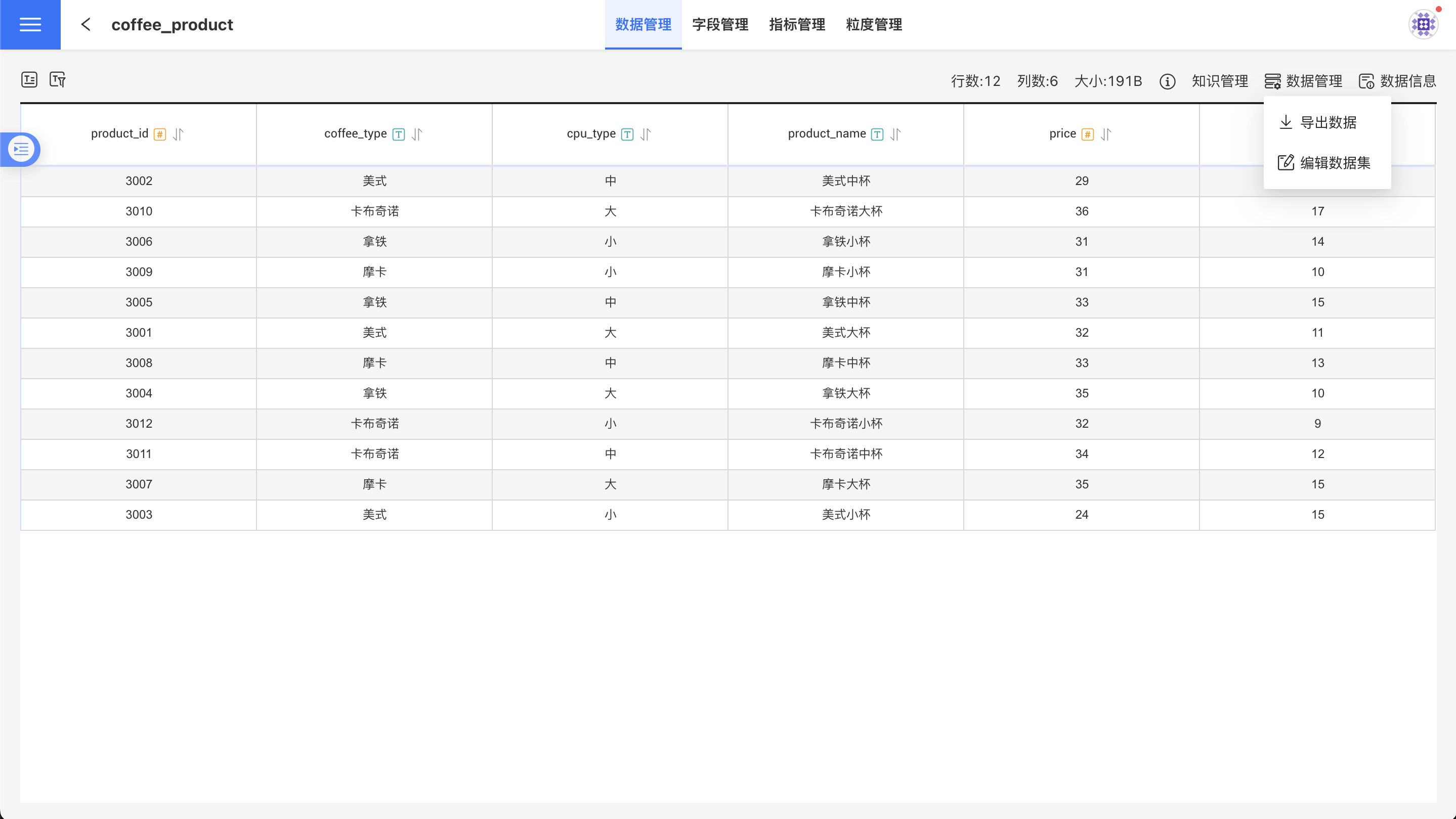 非文件类型的数据集,数据管理菜单提供了编辑数据集和导出数据的功能。编辑数据集时,会有引用检查,已被其他地方引用的字段无法去除,必须保留。