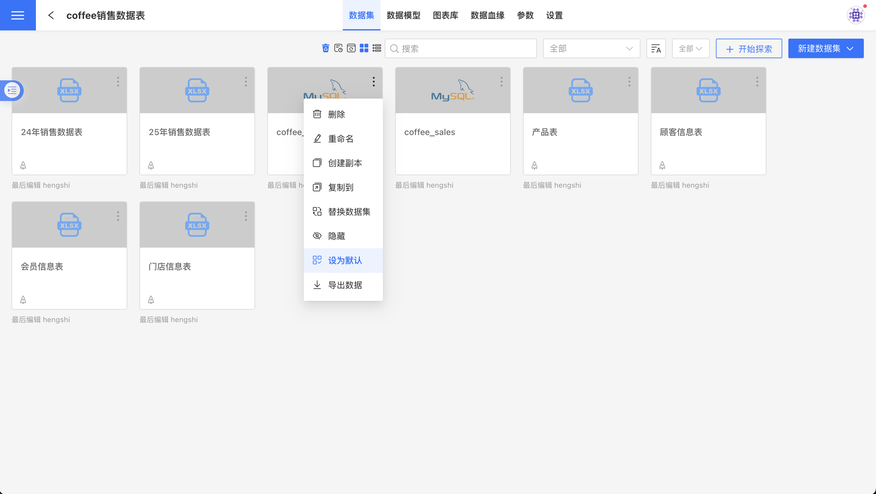系统支持设置数据集为默认数据集,在图表制作过程中,会展示数据包中的默认数据集,减少做图时切换和查找数据集操作。