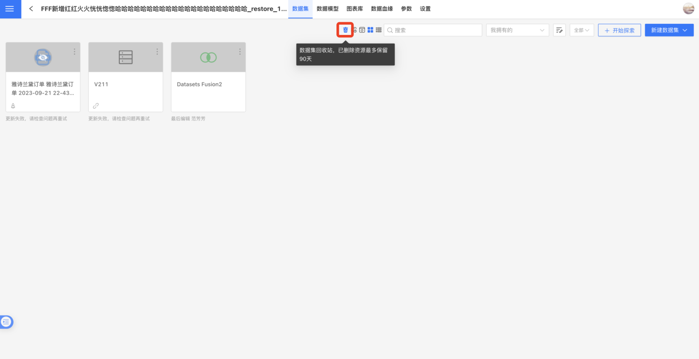 删除数据集时,如果数据集已被关联模型或者图表引用,则无法删除,只能删除未被引用的数据集。此时只是将数据集存放到应用内回收站并不是真的删除。