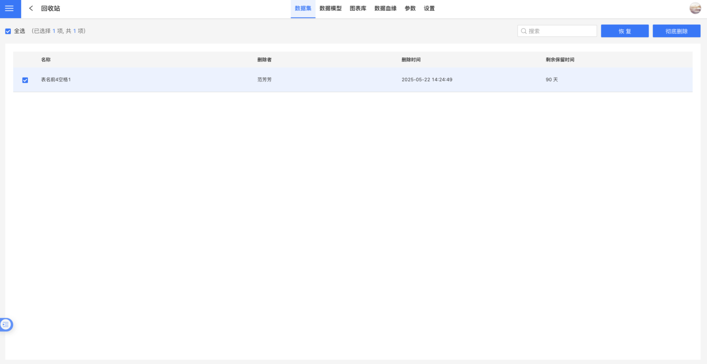 应用内回收站中存放的数据集可以进行恢复,也可以彻底删除,回收站内的资源最多保留90天。有应用管理和应用编辑权限的人才能见到应用内回收站入口。