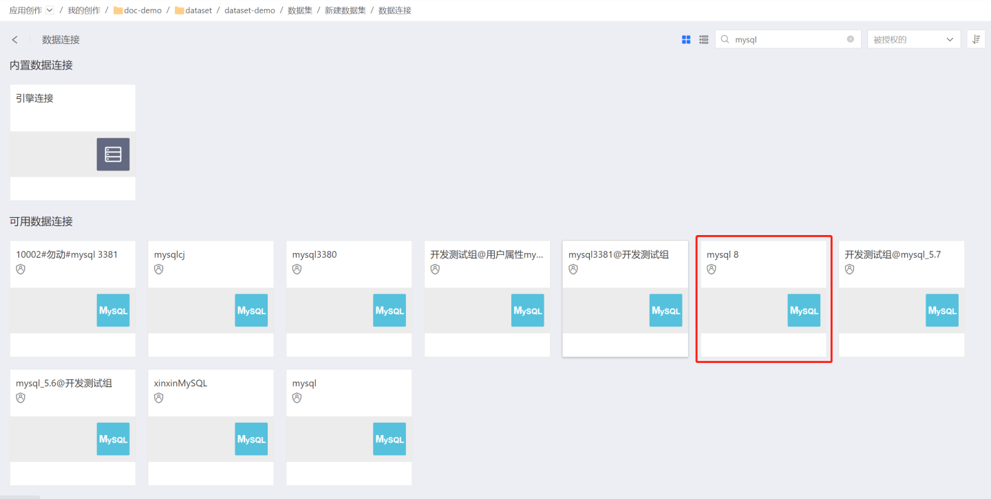 在数据连接中选择创建数据集使用的数据连接。