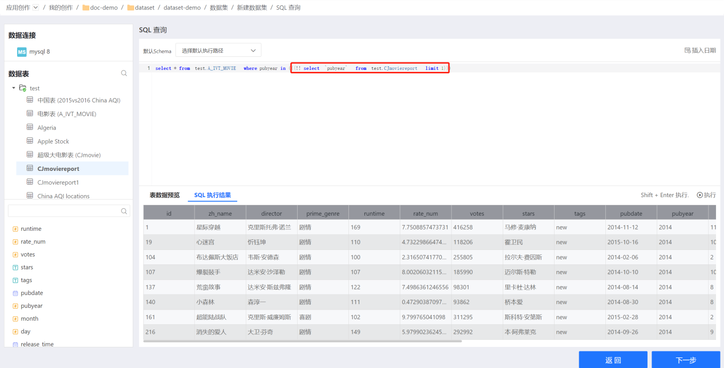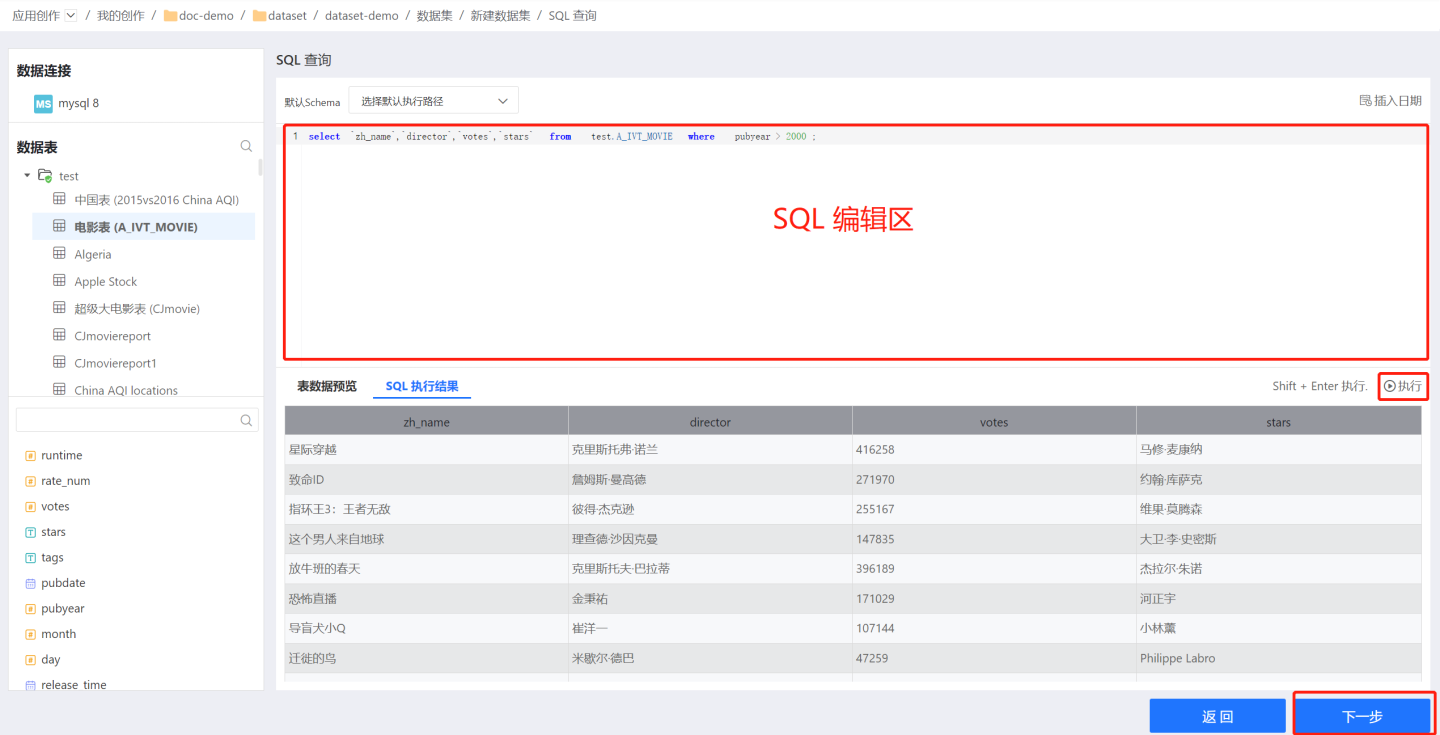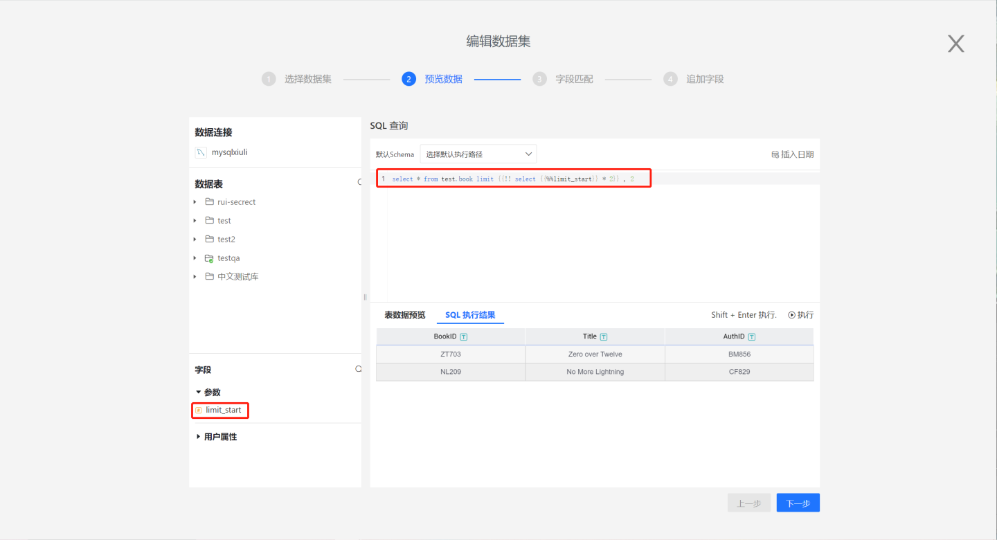 数据连接进行授权后使用。在编辑区内编写 SQL 代码,定义数据集条件。 点击执行查看效果,确认没问题后点击下一步。