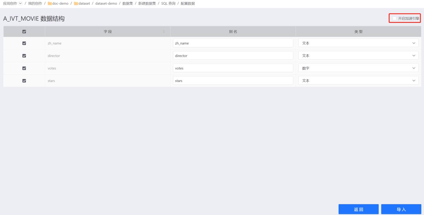 支持设置开启加速引擎,开启后该数据集导入加速引擎中。