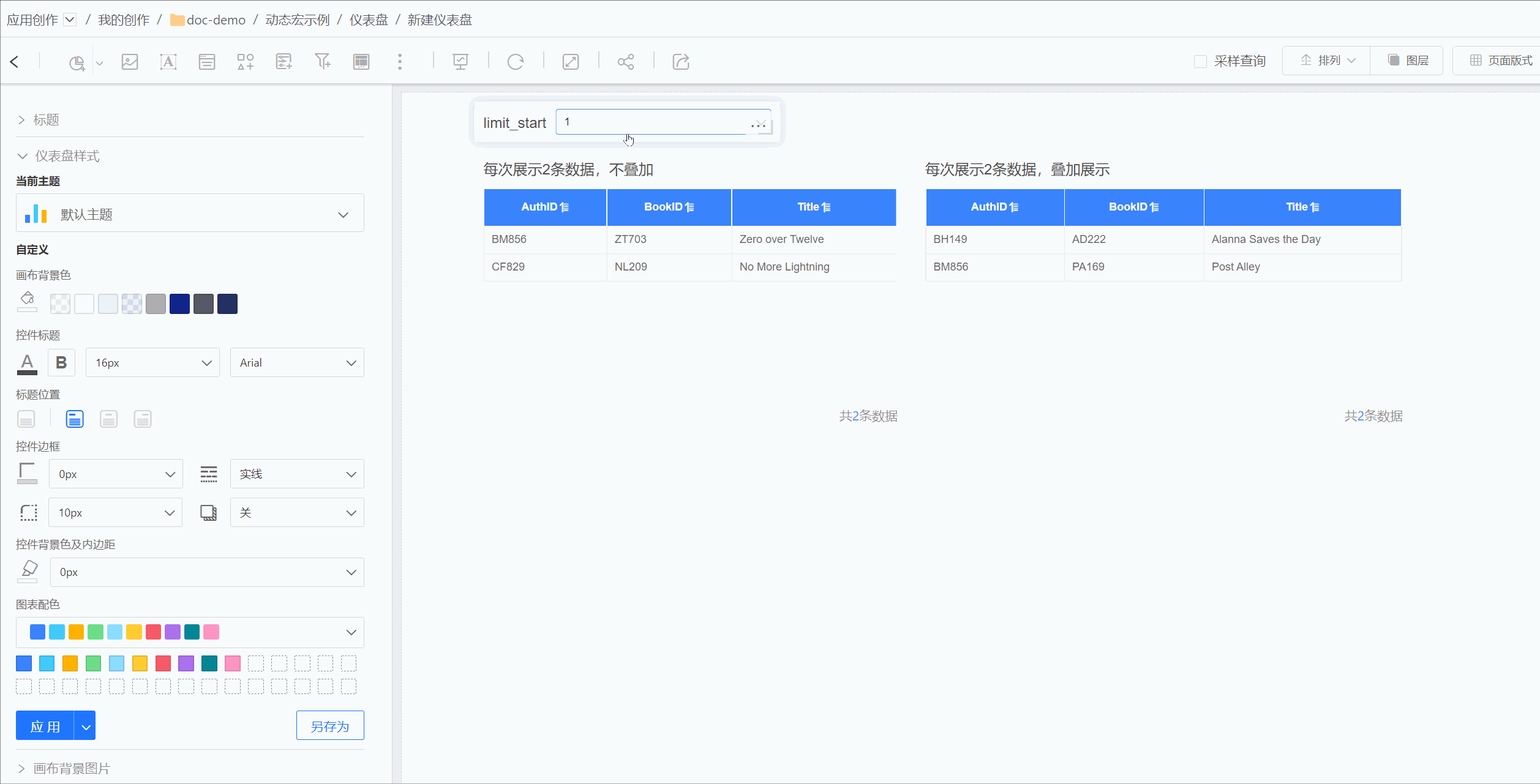 效果展示如图所示,左侧表格通过动态宏实现limit n*2,2 ,每次检索两条数据。右侧表格通过动态宏实现 limit 0,2*n,每次检索两条数据,叠加展示。 两个表格通过同一个参数动态控制检索内容。