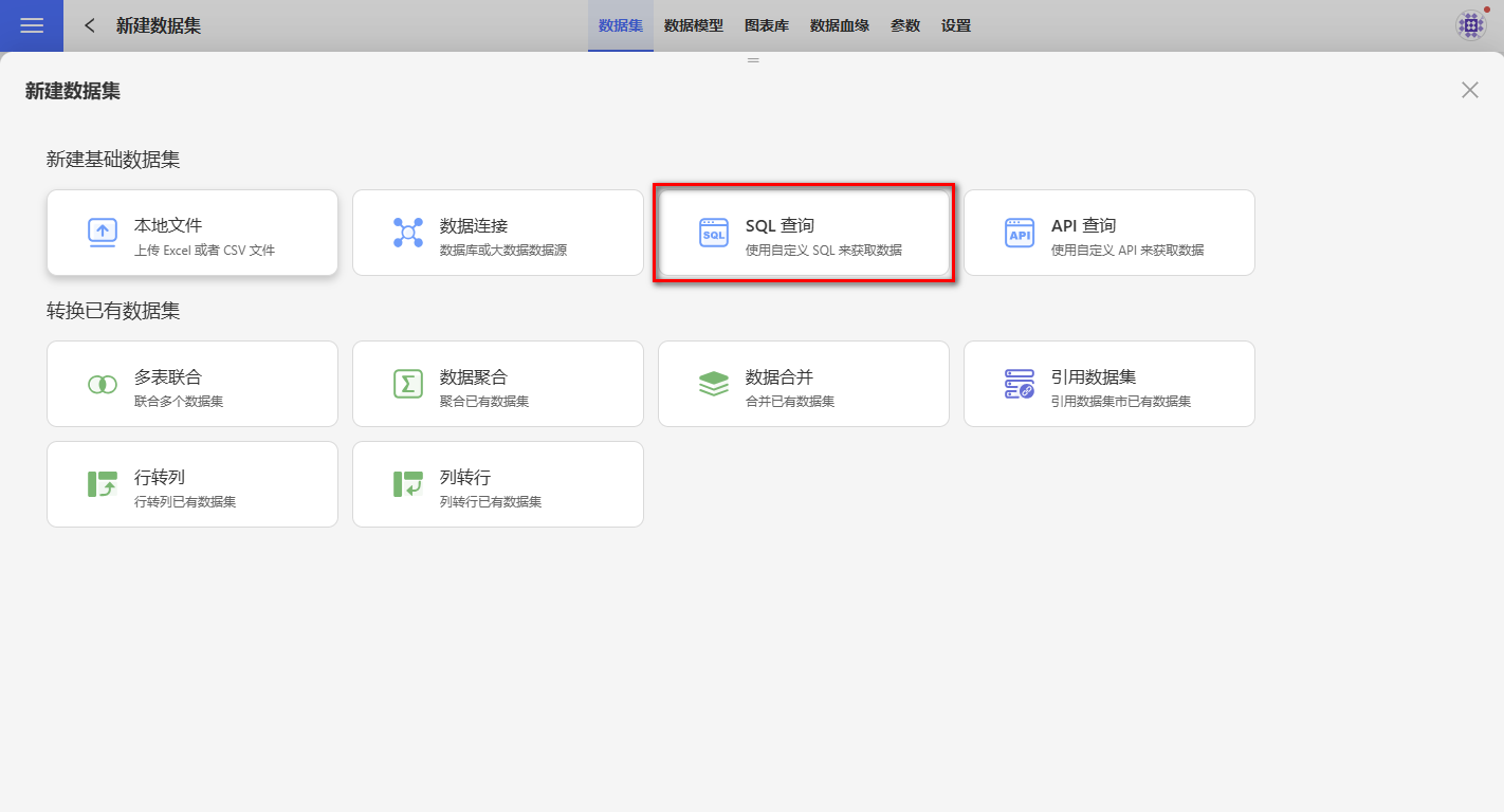 在数据集界面,点击新建数据集,选择 SQL 查询数据集。