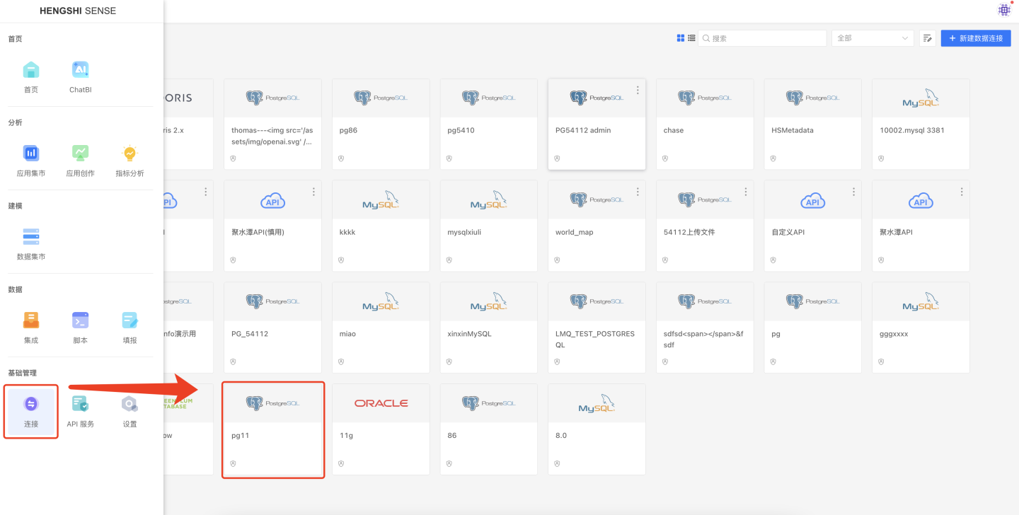 打开启用仓库并点击保存之后,用户可以在外部系统中使用衡石数仓,也可以在 HENGSHI SENSE 中使用衡石数仓创建数据连接,作为普通数据库来使用,进行读写。创建连接时,连接类型可以选择 postgresql 或者 greenplum。