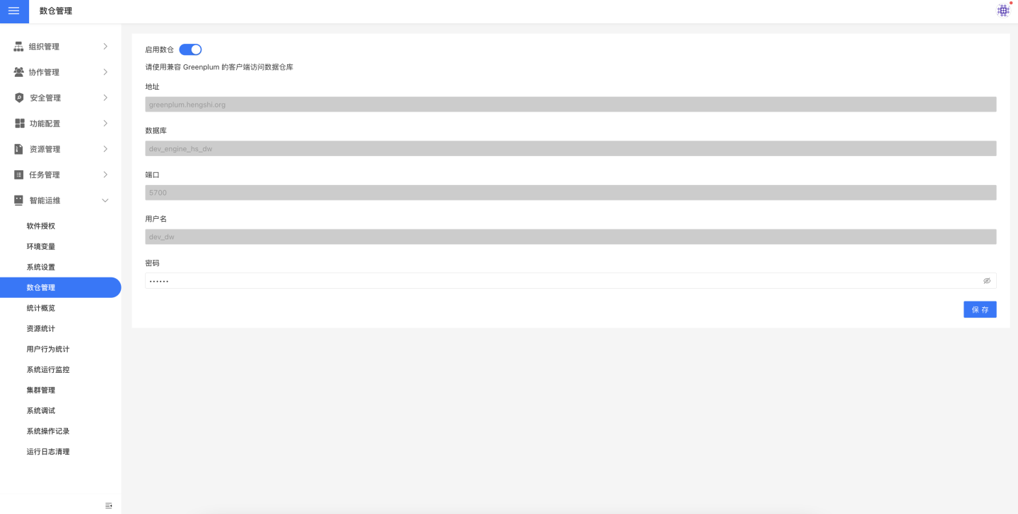 系统管理员打开设置->智能运维->数仓管理,将打开数仓管理页面。该页面会返回系统使用的数仓的系统信息,包括主机地址、数据库、端口、用户名和密码。