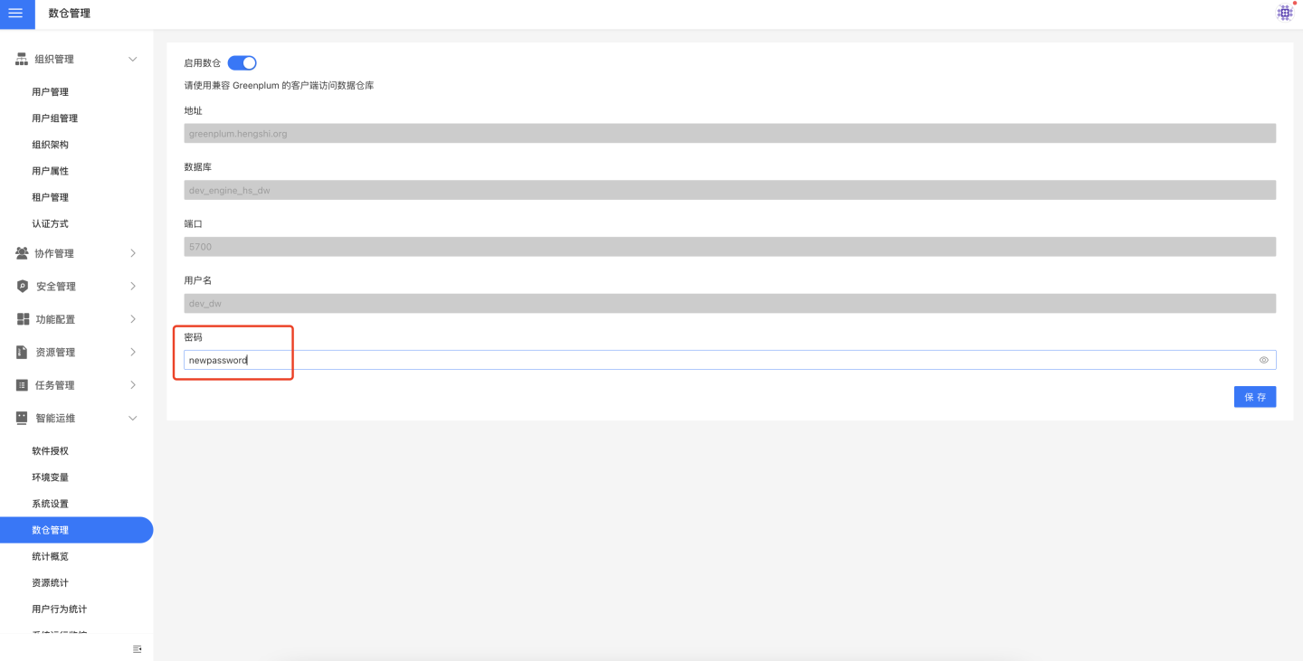 在数仓管理页面,可以在密码文本框中输入新密码来修改数仓密码,这是为了便于在衡石中管理数仓。