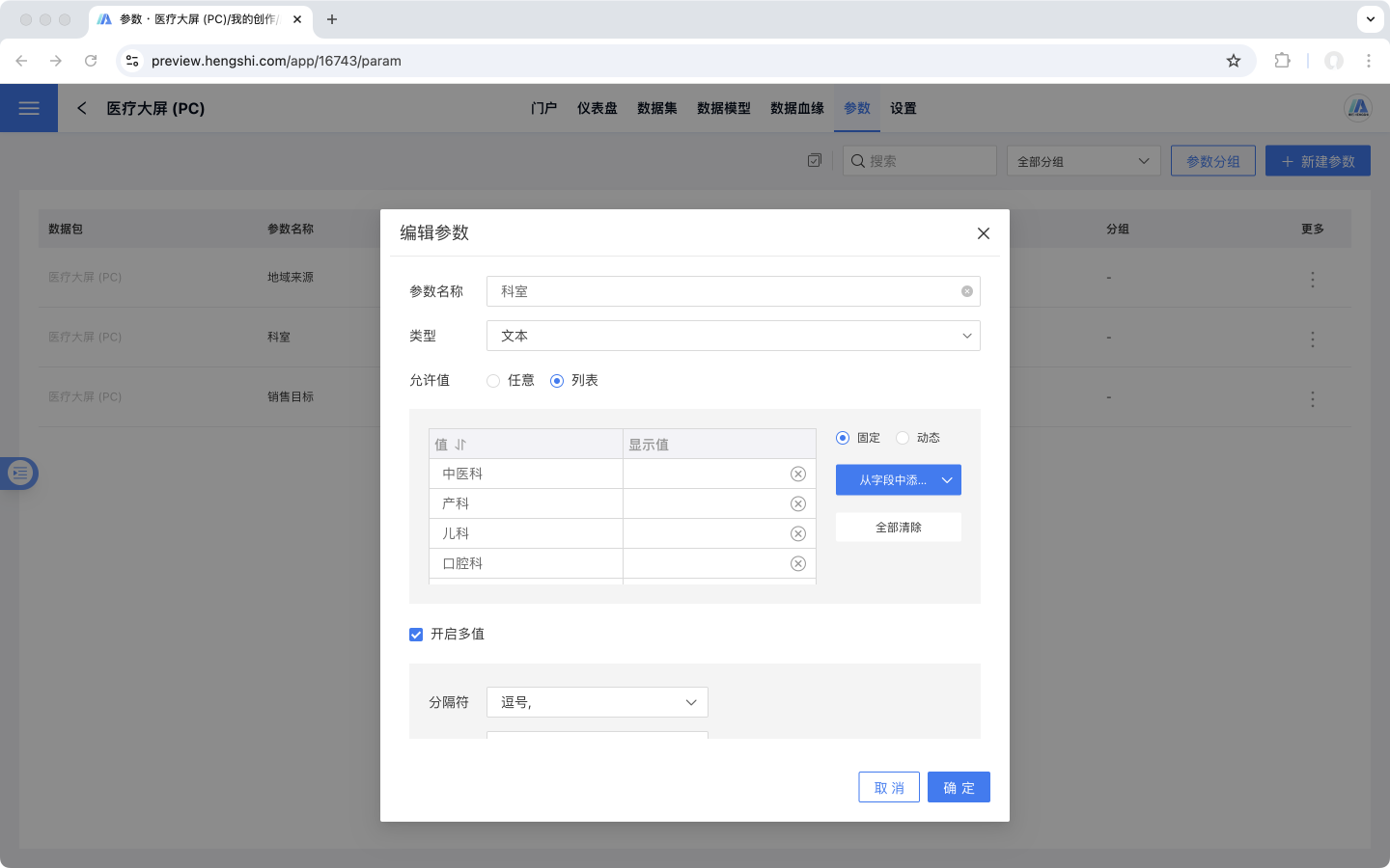 科室与地域来源参数均为开启多值的文本类型固定列表参数,参数配置如下:
