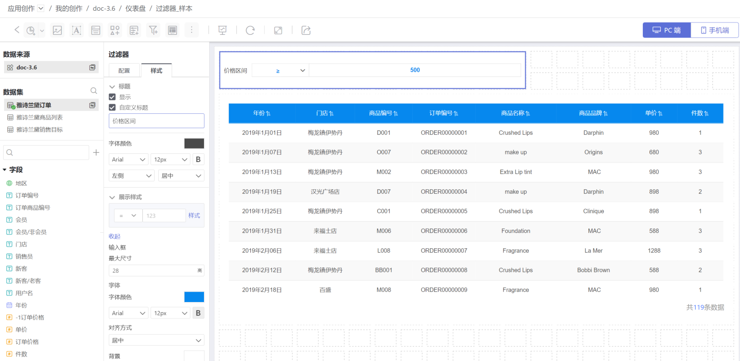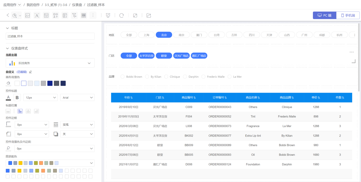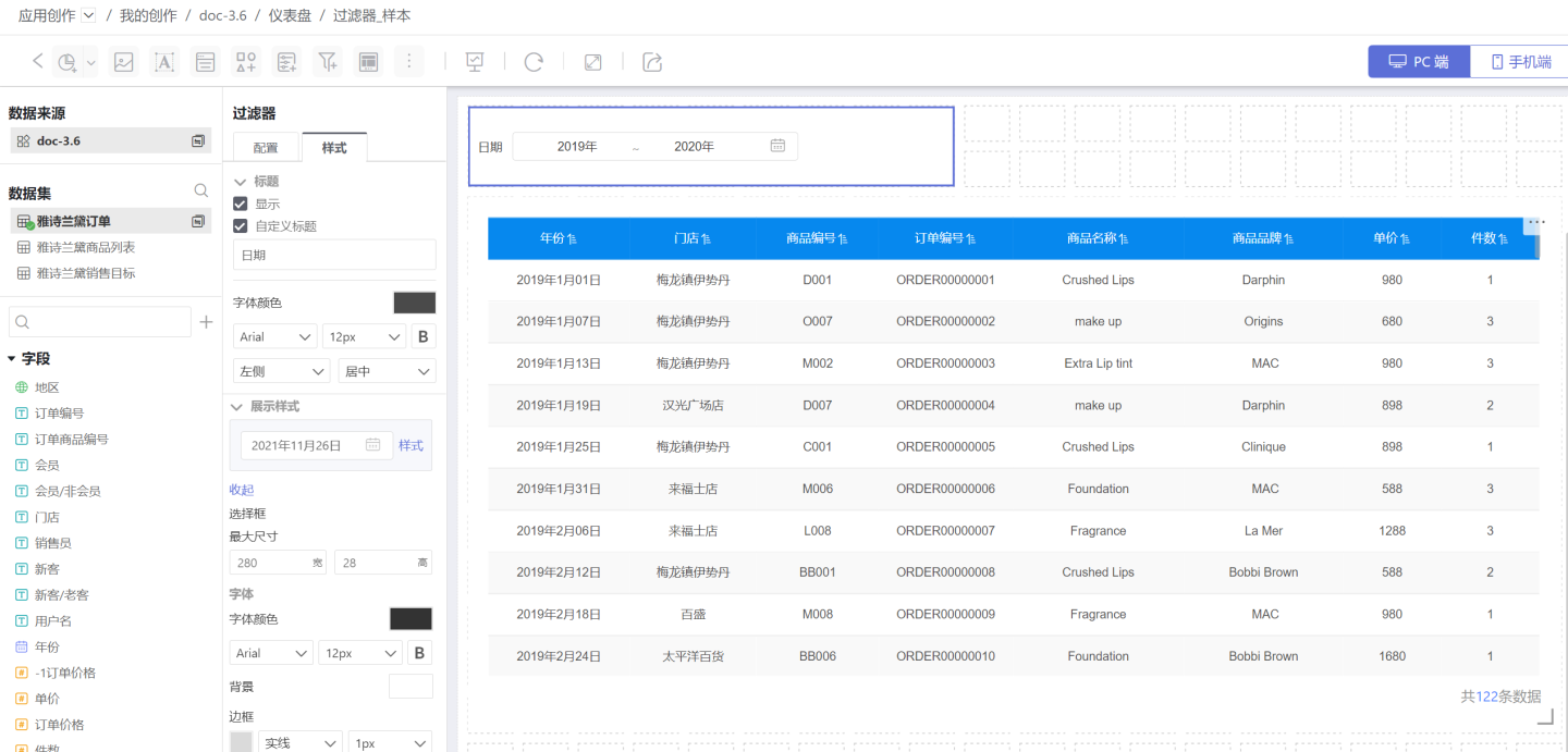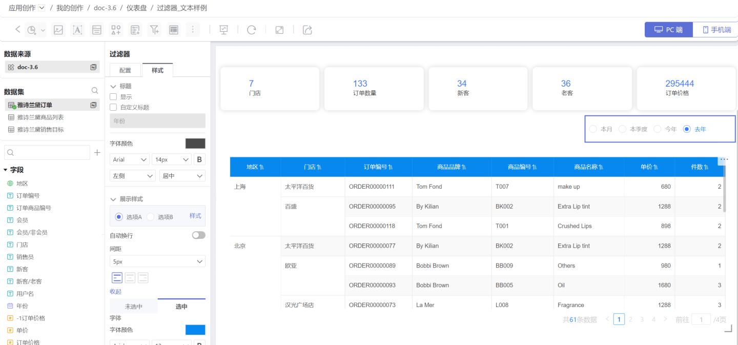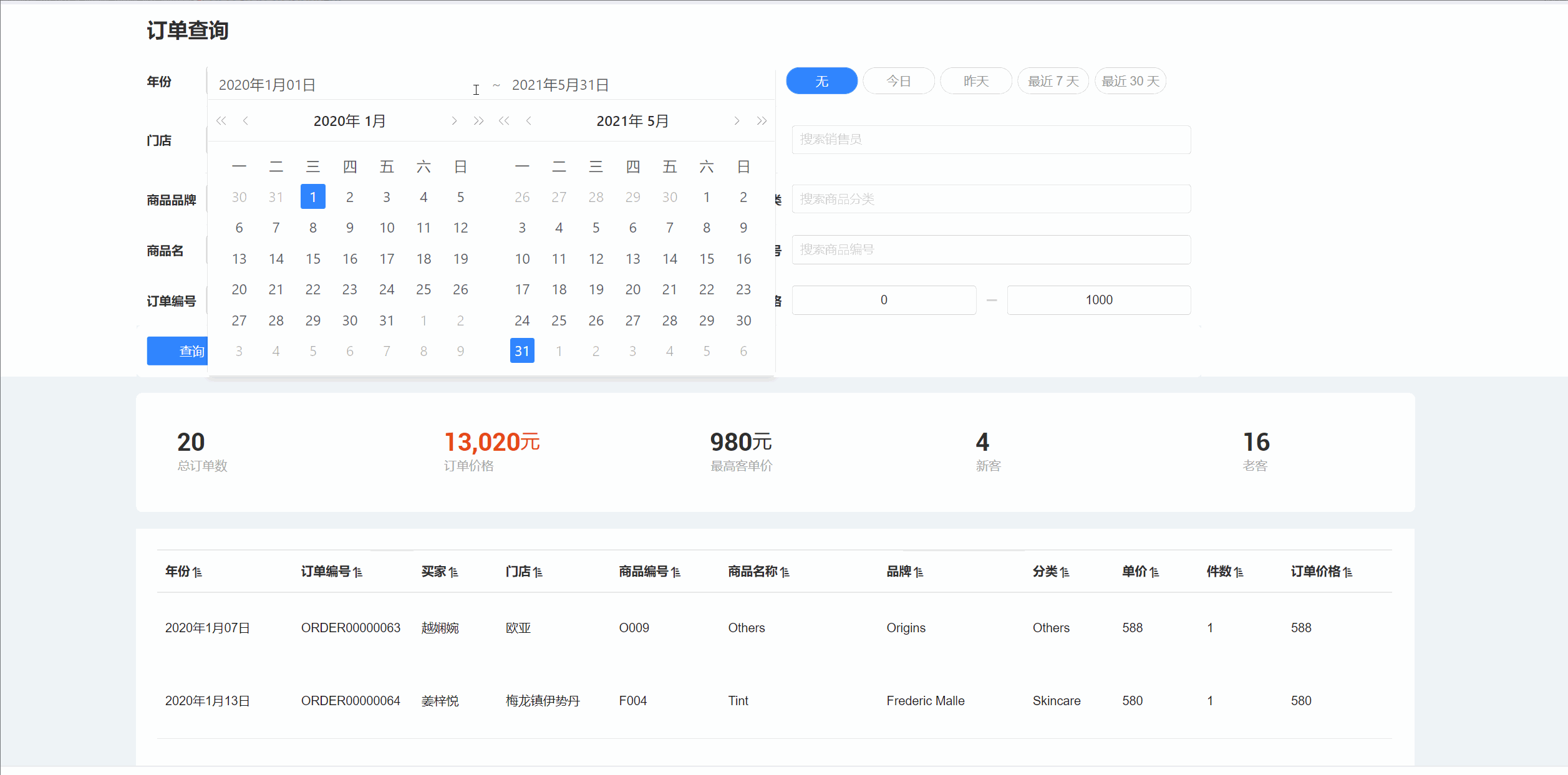 下图是订单查询系统。可以通过年份(时间过滤器)、时间段(时间过滤器)、门店、订单价格(数字过滤器)等查询订单信息。