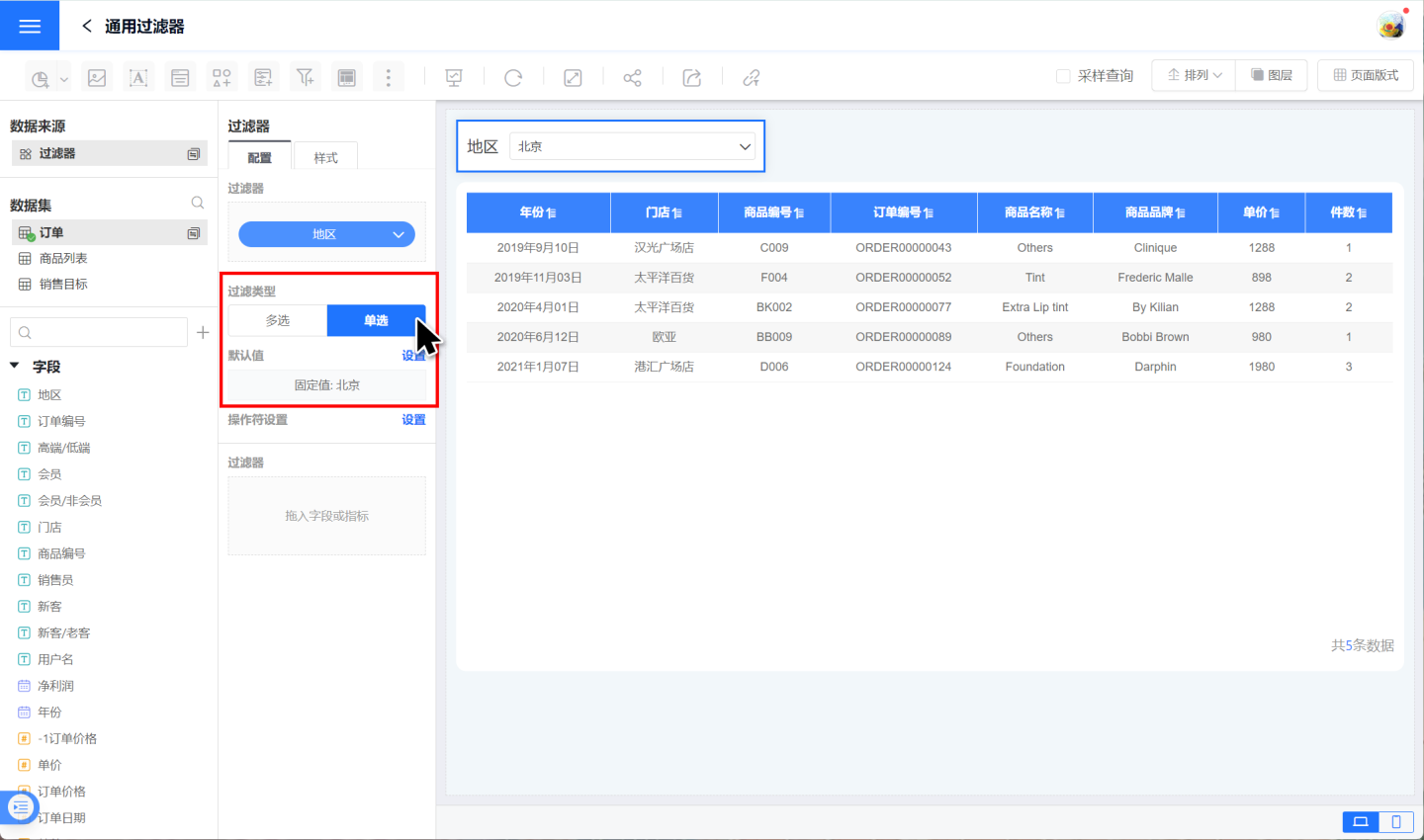 选择过滤相应类型,并设置过滤器默认值。示例中选择单选过滤类型,默认值设为“北京”。