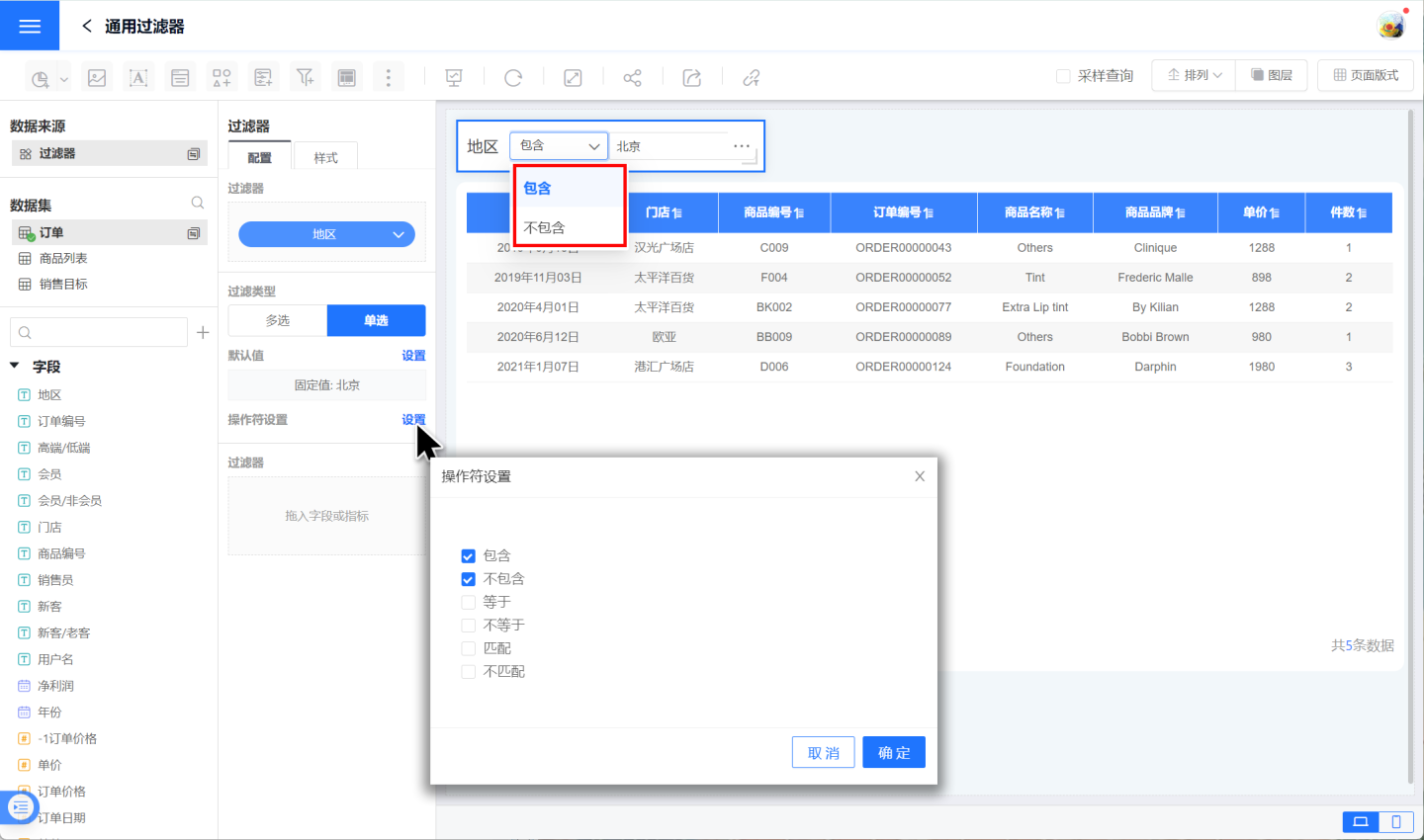 设置过滤器操作符,即过滤选项的操作方式。 示例中设置了包含过滤选项和不包含过滤选项两种筛选操作。