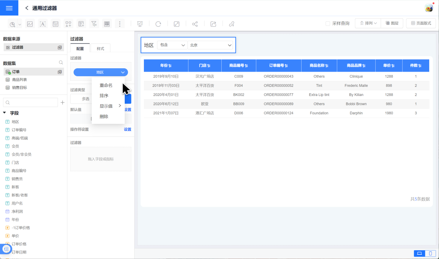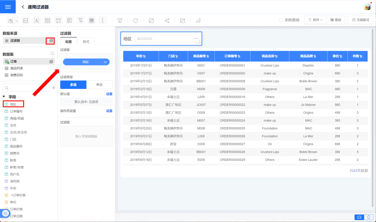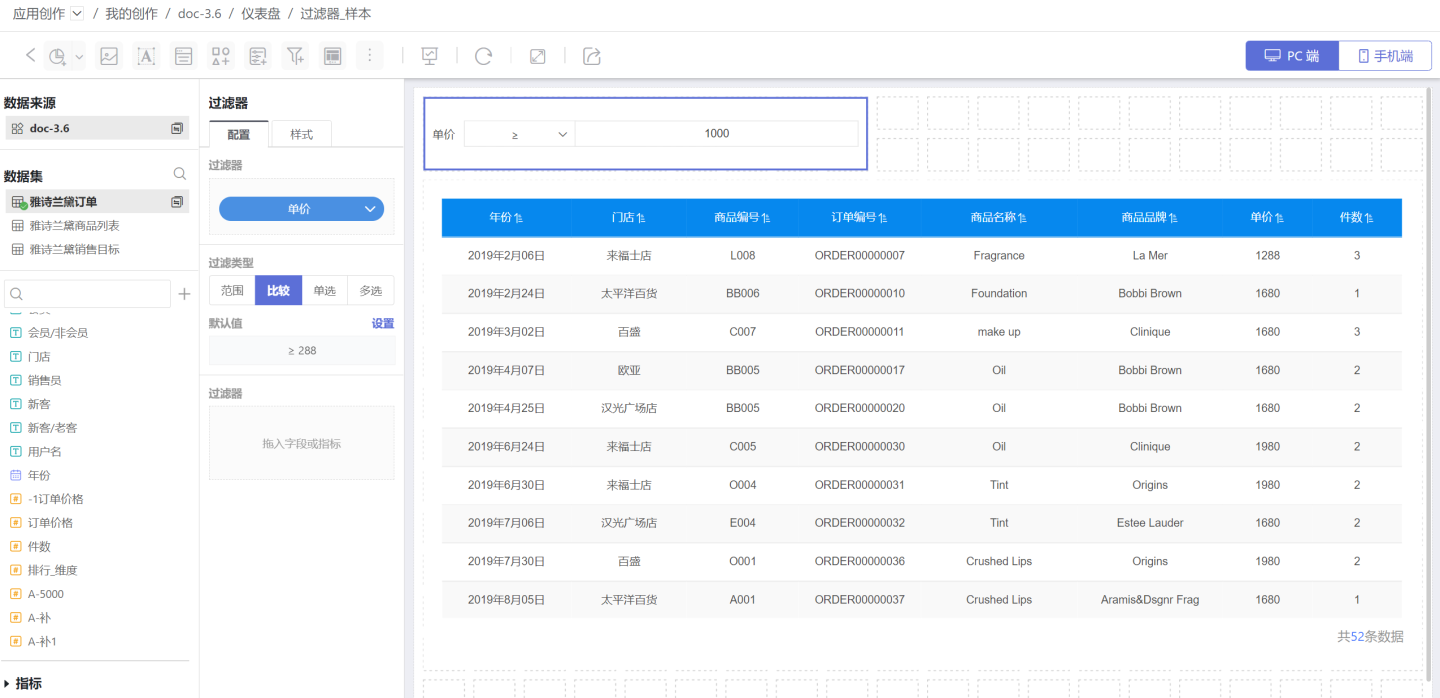 在通用过滤器中,使用数字字段筛选数据的过滤器就是数字过滤器。 示例为某产品在全国商场销售情况,当查看单价大于1000元时的订单情况时,就需要添加数字过滤器来实现。