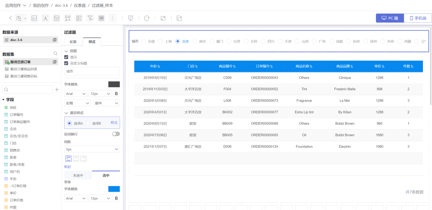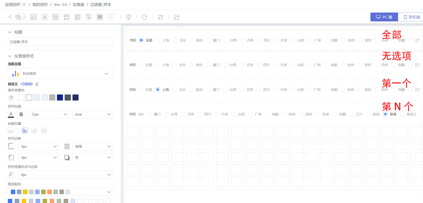 过滤器样式设置:可以在样式中设置标题、展现样式、选中状态等。支持下拉和平铺多种样式。