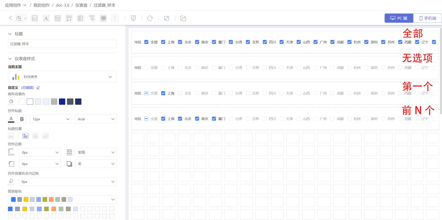- 动态选中: 动态的配置过滤器的默认值,支持: 全部、无选项、自定义、第一个、前 N 个。示例展示了动态选中方式下过滤器的展现效果。