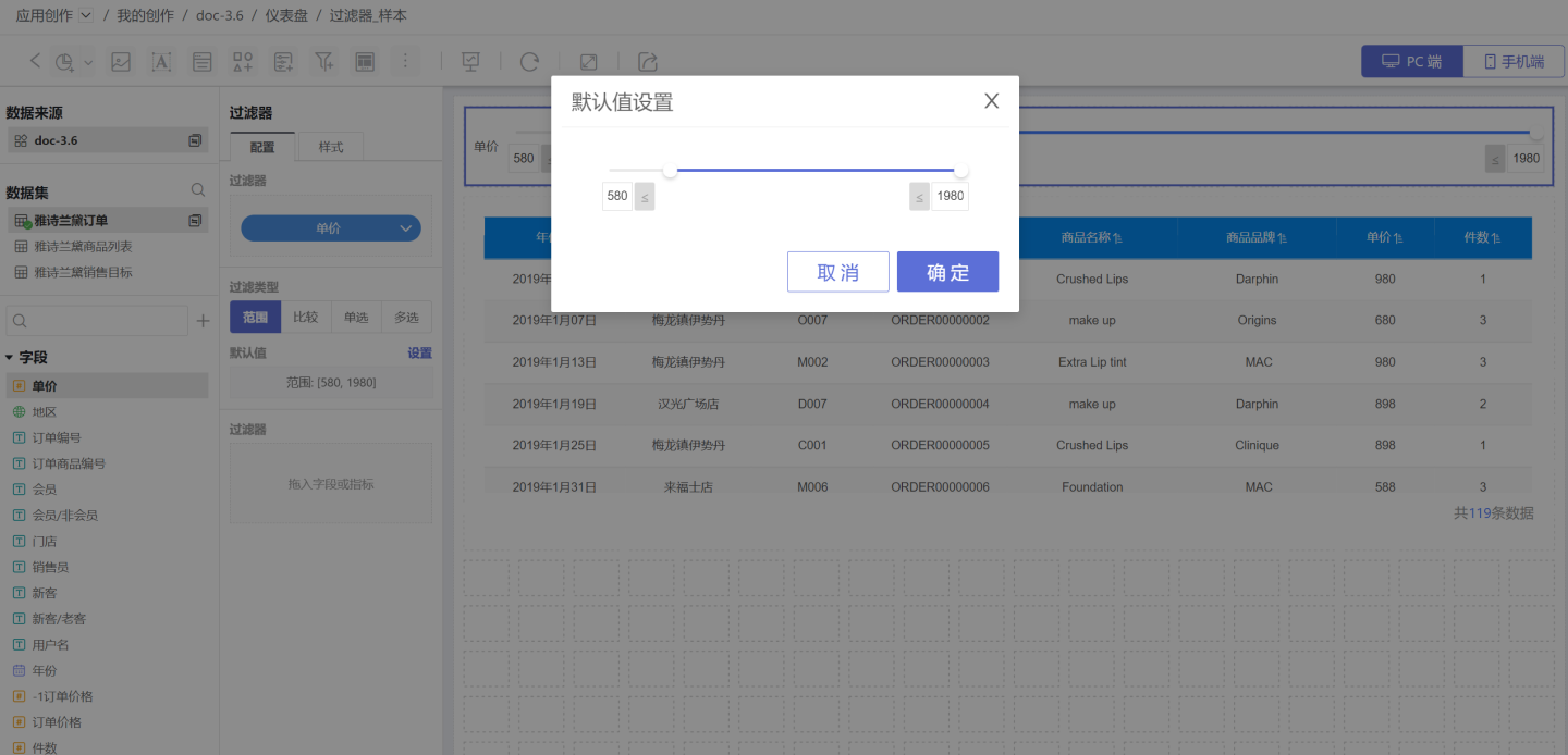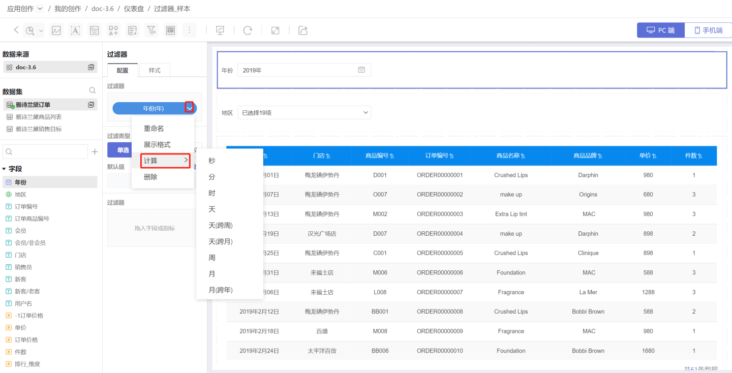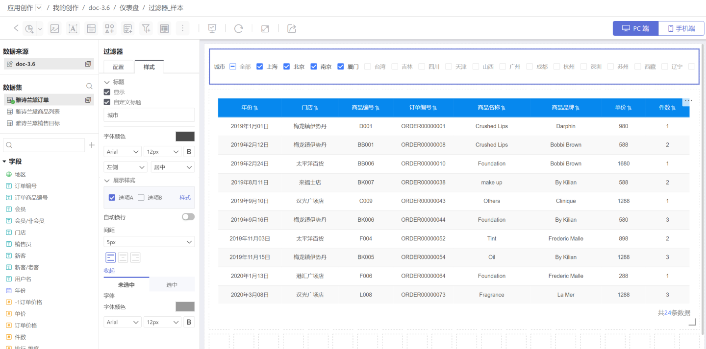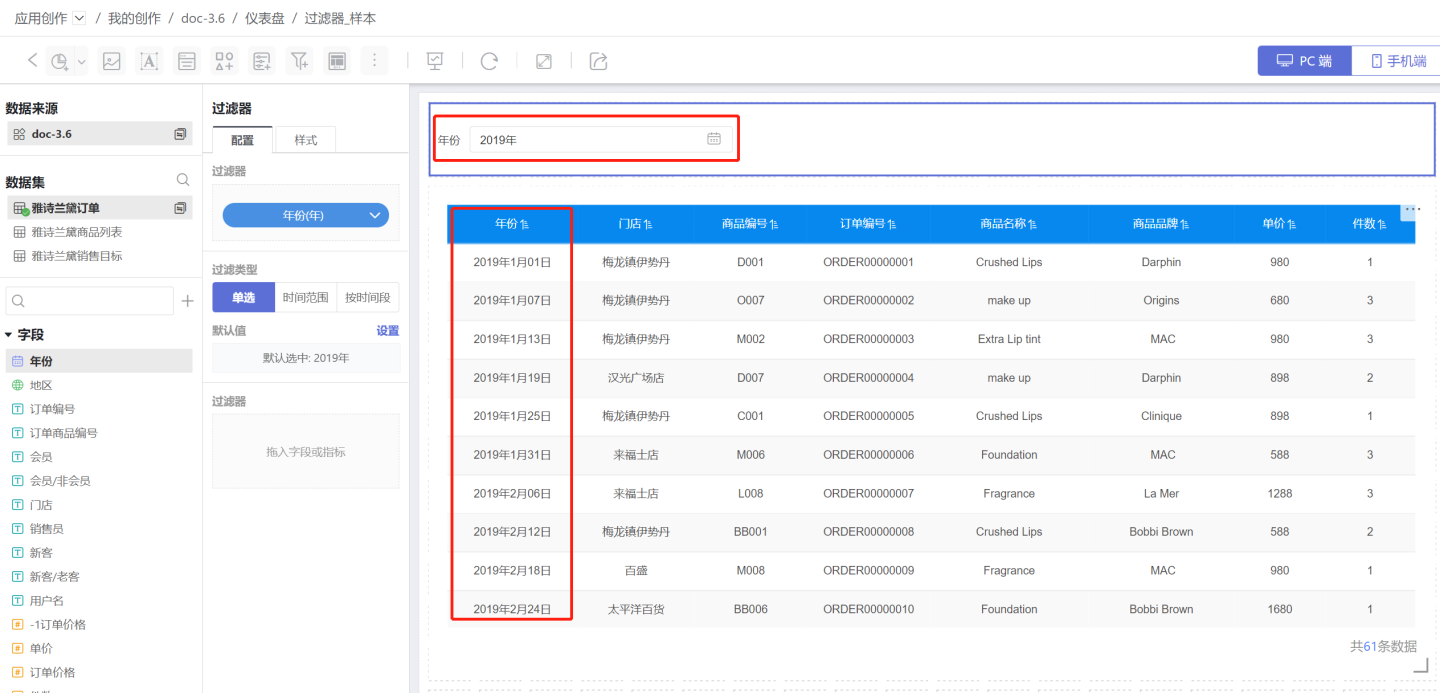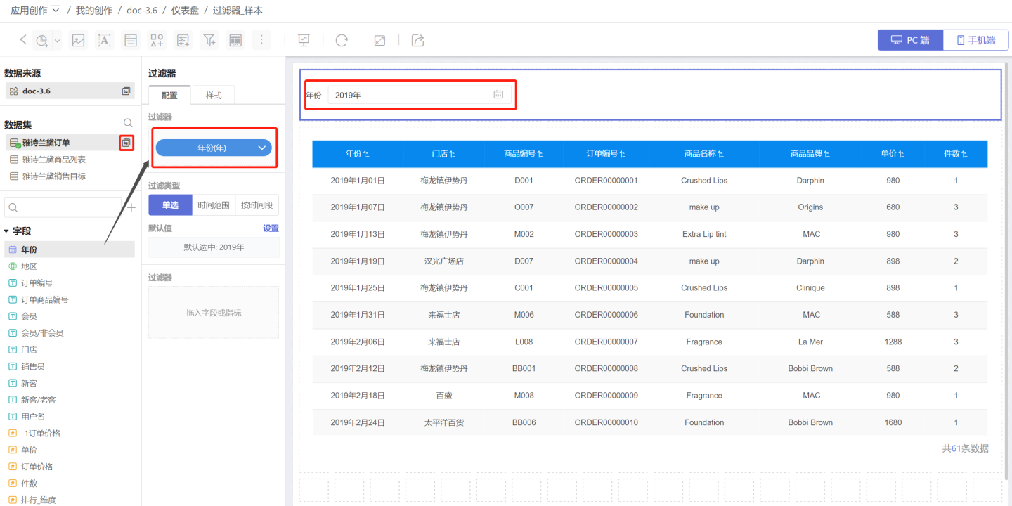 在通用过滤器中,使用时间字段筛选数据的过滤器就是时间过滤器。 示例为某产品在全国商场销售情况,当查看2019年的销售情况时,需要添加时间过滤器来实现。