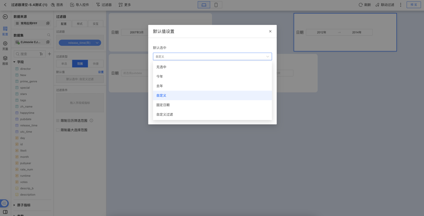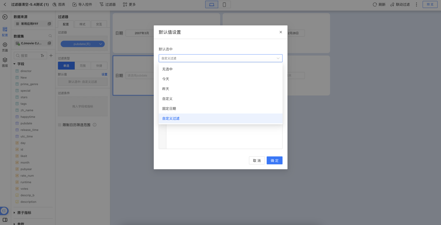 - 自定义过滤:可通过写表达式的方式过滤数据集字段值作为过滤器默认值,表达式过滤结果为多值时,取日期的最大值和最小值作为日期范围默认值。