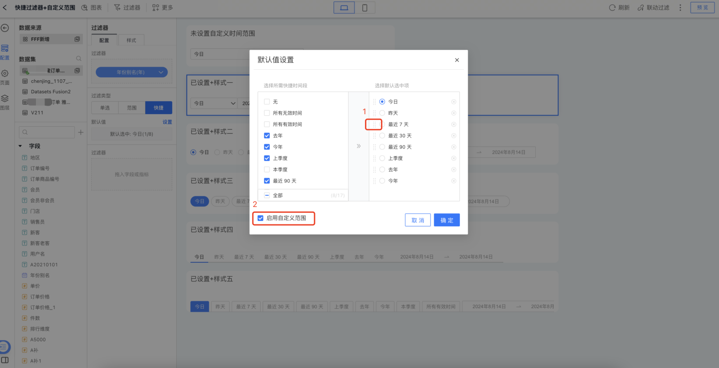 - 自定义:自定义中展示前 N 天的数据,过滤器中选中前 N 天的字段。