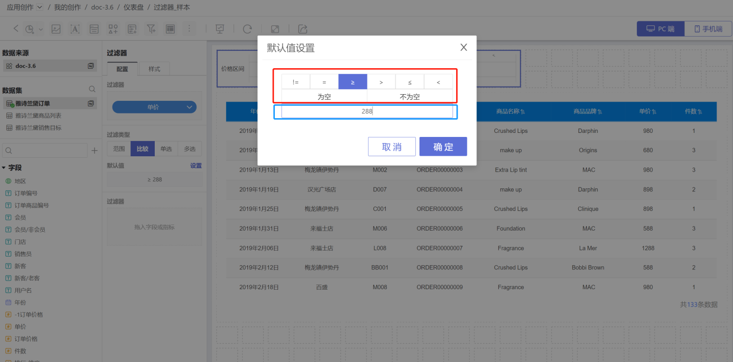 比较类型的过滤器指当过滤选项满足比较条件时筛选对应的数据。默认值设置时需要设置比较类型(图中红色框)和比较数值(蓝色框)。比较的类型包括: 不等于、等于、大于等于、大于、小于等于、小于、为空、不为空。