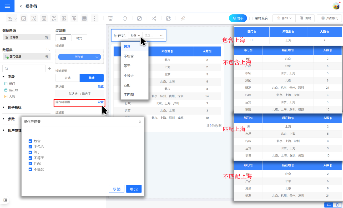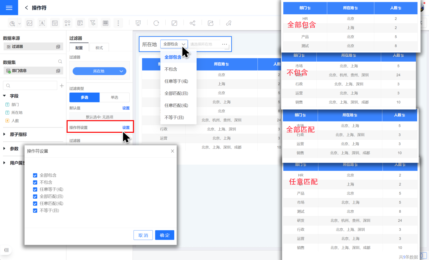 - 全部包含:表示包含所有的过滤选项对应的数据信息。如“所在地”全部包含“上海”、“北京”,则筛选出“所在地”=“上海”和“所在地”=“北京”的数据信息。