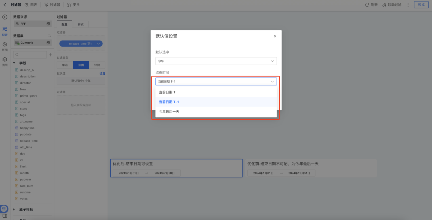 时间范围过滤器,当日期字段计算粒度为“天/时/分/秒”时,默认值选择今年、本季度、本月、本周时,其结束时间可设置为“当前日期 T / 当前日期 T-1 / XX 最后一天”。