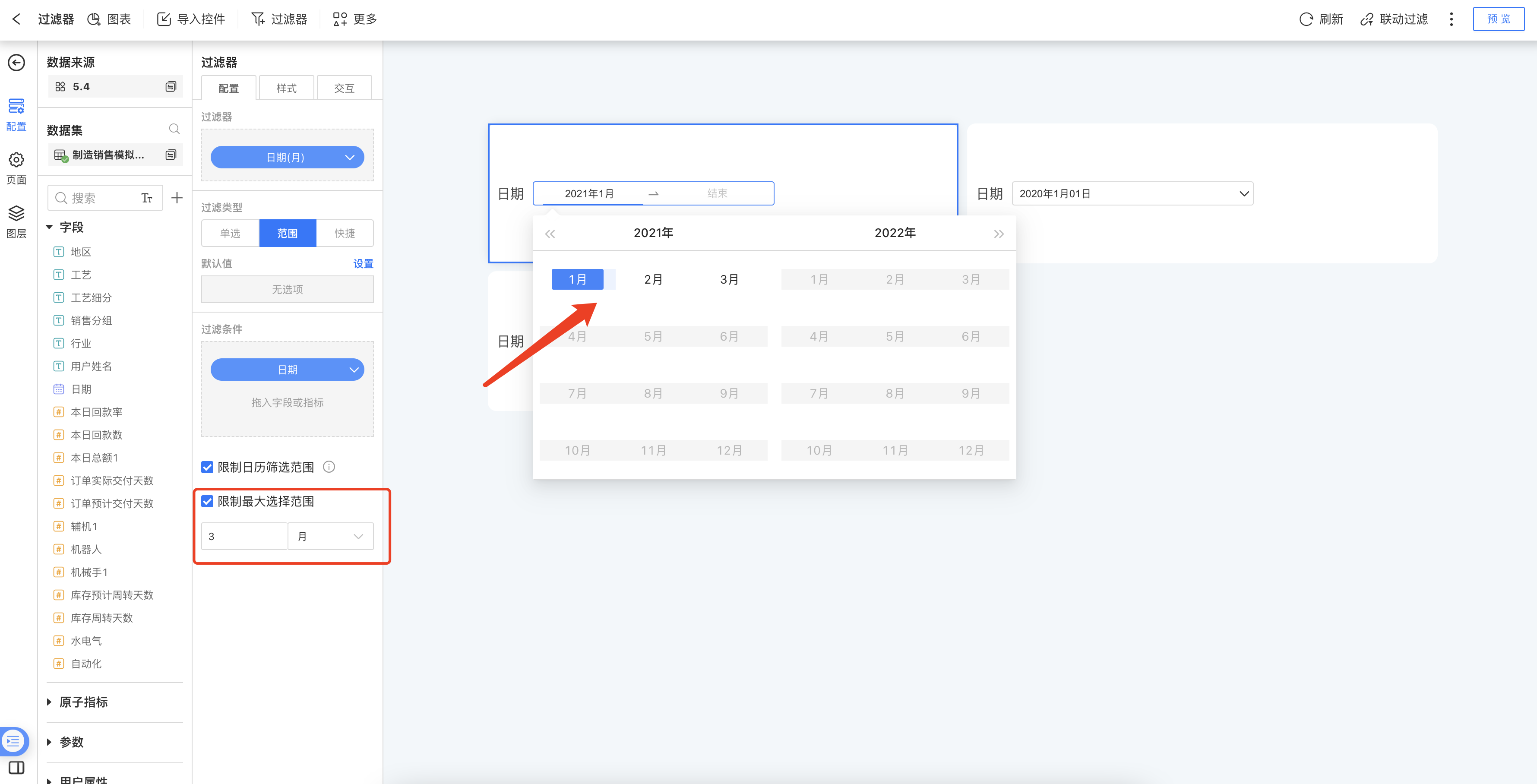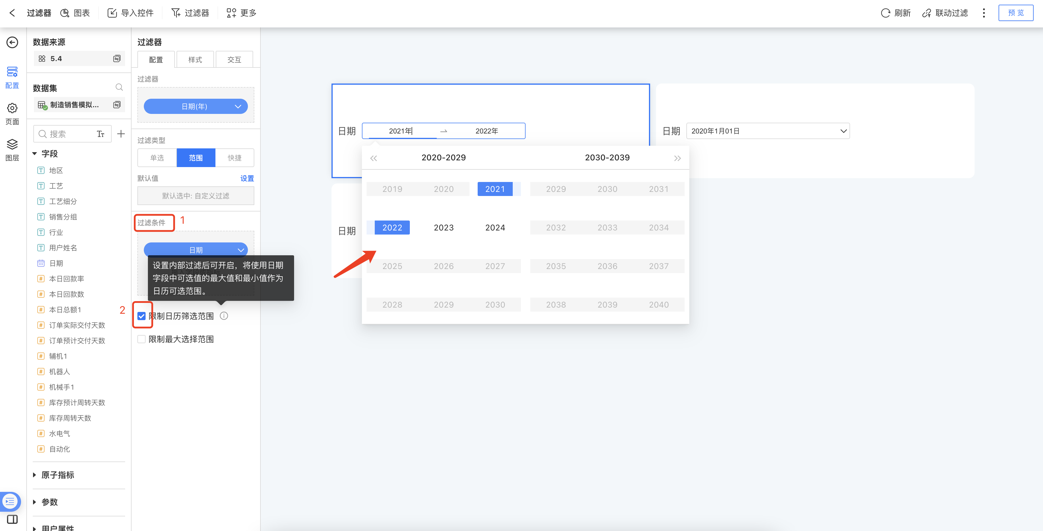 限制日历筛选范围:开启后,日历可选区间将根据内部过滤的日期字段可选值的最大值和最小值作为可选范围。如内部过滤后的范围为2021年至2024年,那么日历可选范围则为2021年至2024年,未配置内部过滤条件时,暂不支持开启配置项。
