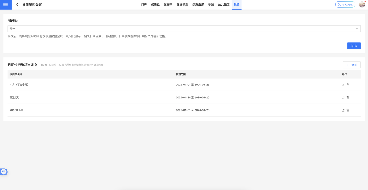 6.2 版本新增应用级自定义日期快捷选项功能。系统管理员可在应用设置 > 日期属性设置中统一配置日期快捷项,实现"一处配置,全应用生效"。