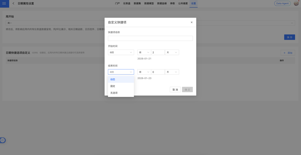 配置说明: 配置完成后,上述场景中的快捷时间段选项将按全局设置统一展示,确保系统交互体验的一致性。