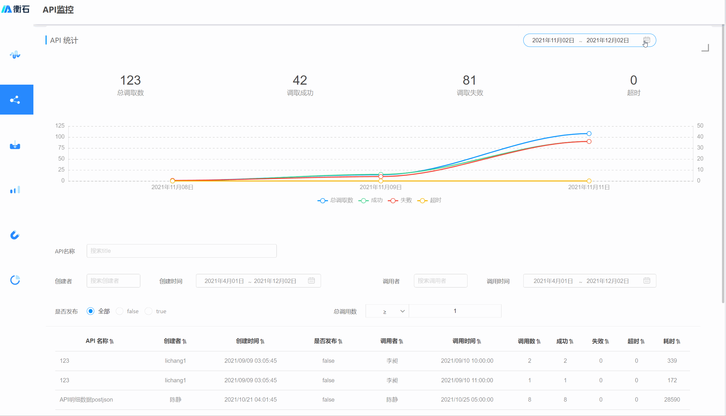 下图是某公司 API 监控系统,显示了 API 统计情况及 API 相关信息。在系统中可以通过 API 的创建时间(时间过滤器)、API 的调用时间(时间过滤器)、发布情况(文本过滤器)、总调用数(数字过滤器)来查看 API 信息。示例演示了查询近半年时间 API 统计情况及总调用数大于100的 API。