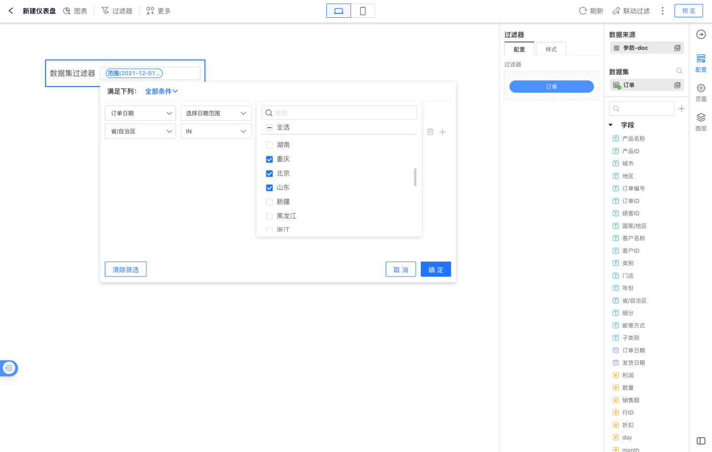 在仪表盘中添加数据集过滤器