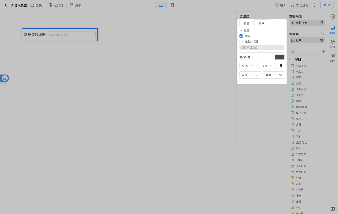 在仪表盘中选中过滤器,设置数据集过滤器的样式,包括标题和字体颜色等样式。