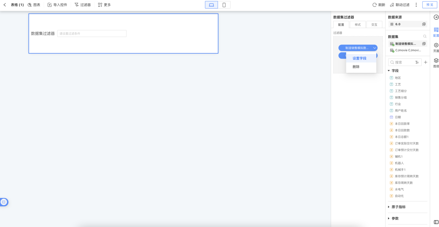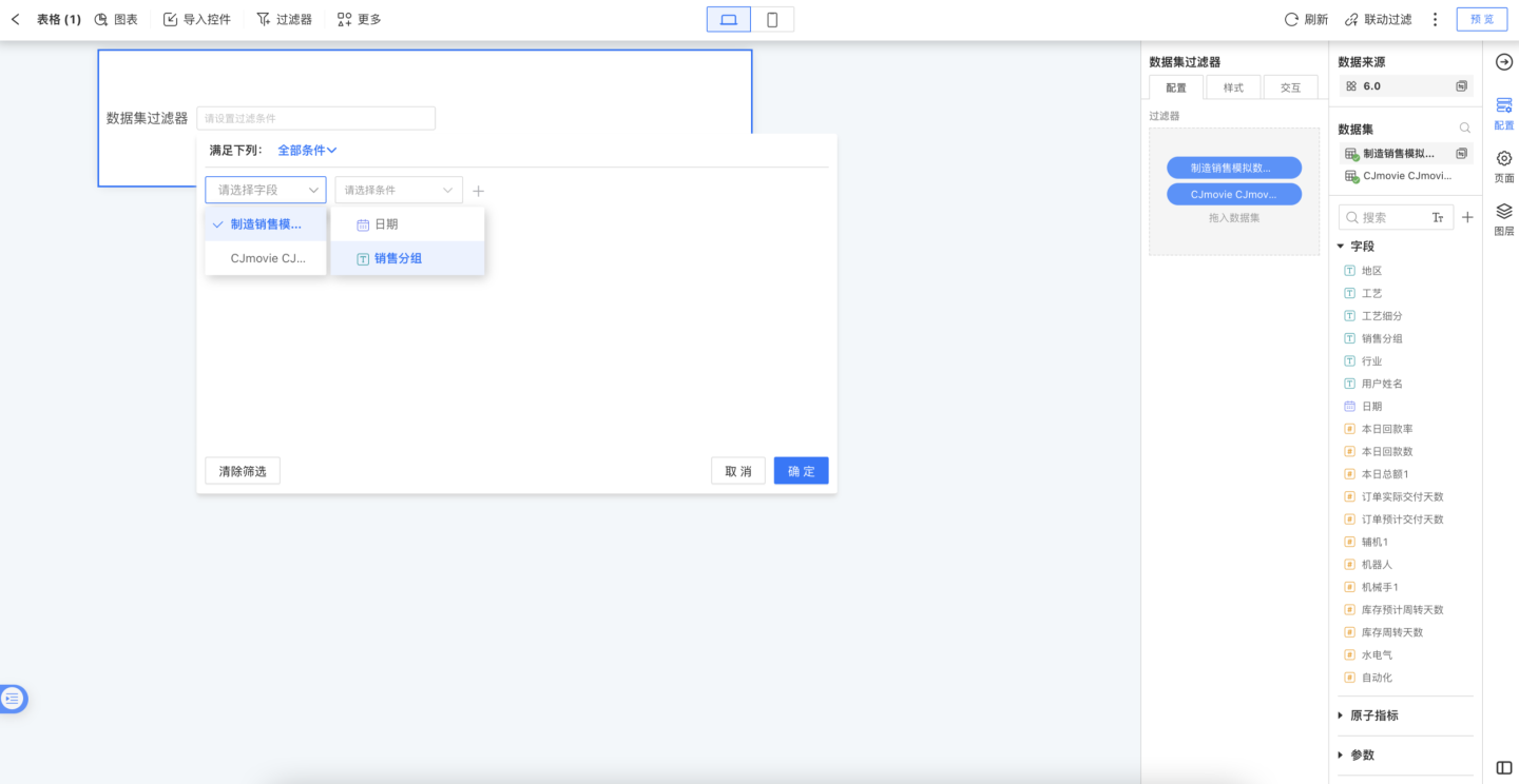 数据集过滤器,可以在查看报表时用任意字段(已隐藏字段除外)来进行数据过滤,而不是在仪表盘制作时指定。
