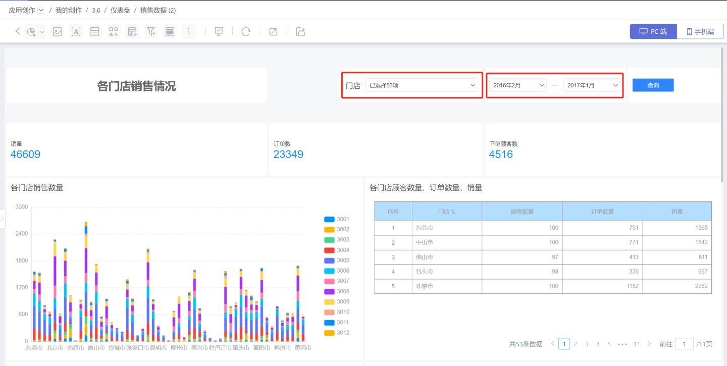 在数据分析中,同一个仪表盘需要根据不同的条件展示不同的结果。如各门店销售情况的示例,用户可能要展示2017年1月所有门店的销售情况,也可能要查看2016年全年销售情况,并对比分析出销售情况不理想的门店,这种情况可以在仪表盘中添加门店、时间过滤器,进行条件选择,筛选出符合的数据。