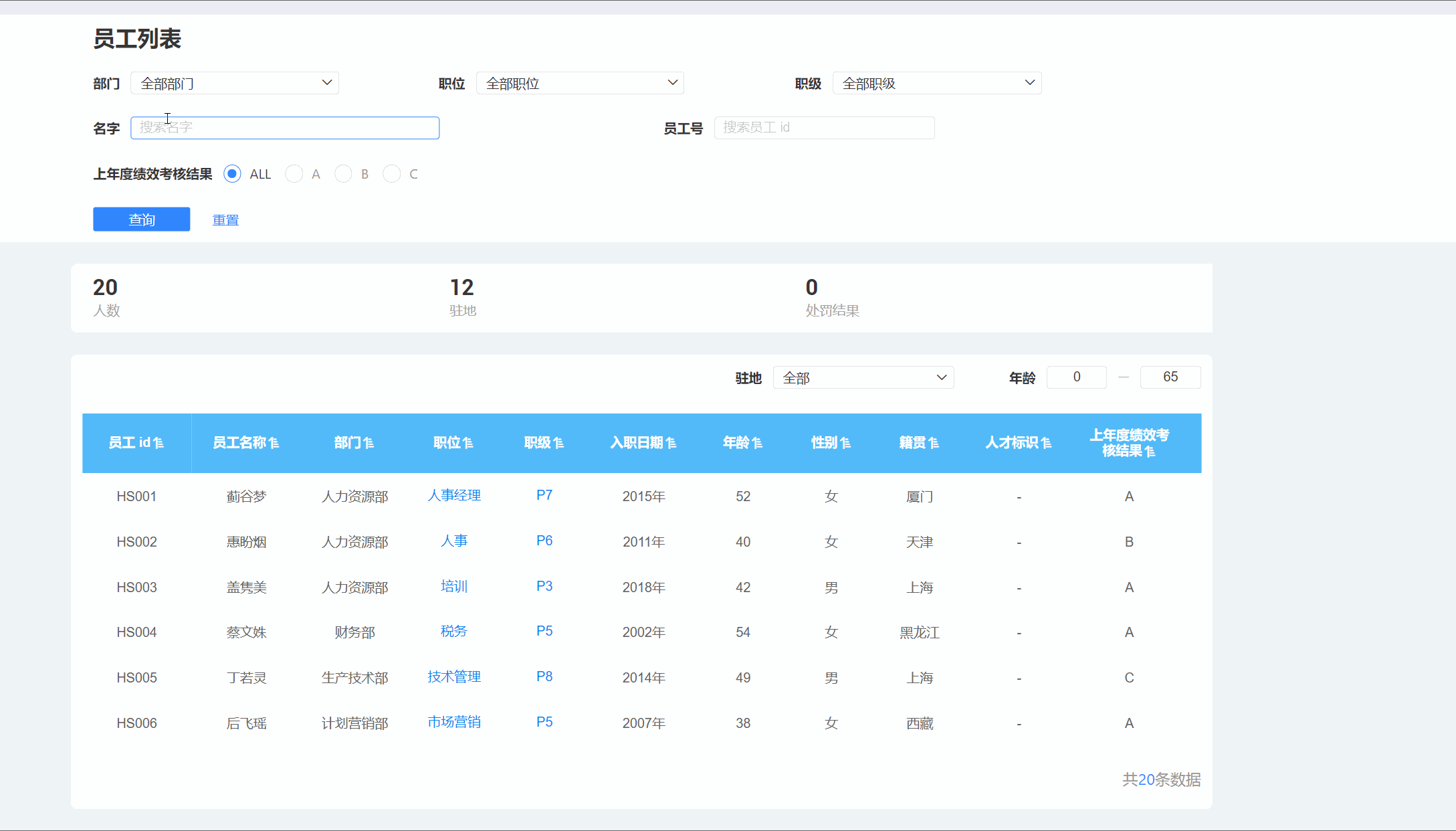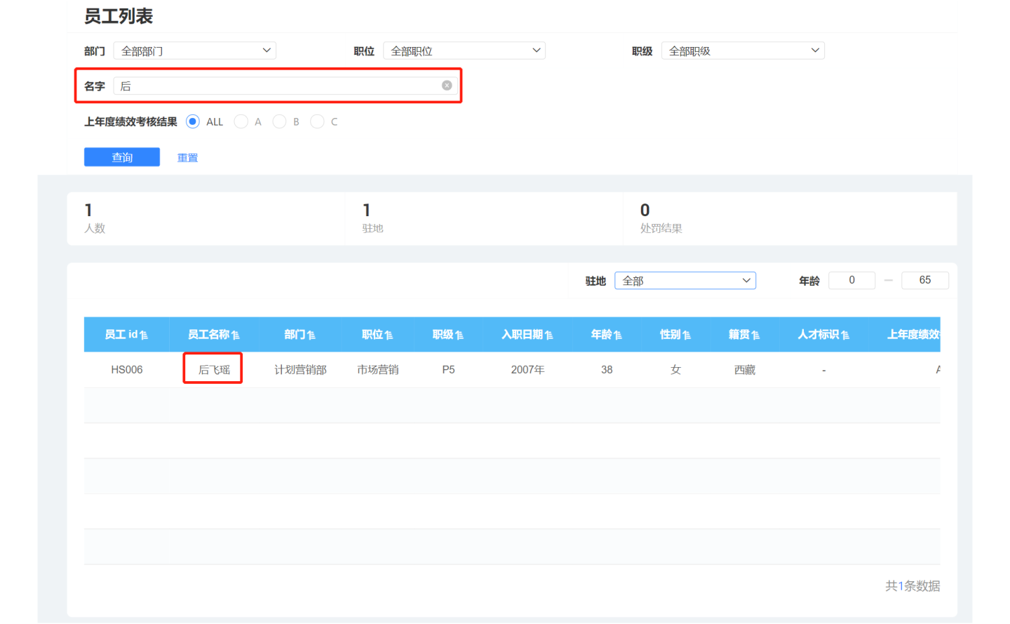 下面是文本搜索框在员工表系统中的应用示例,用户可以通过输入姓名和员工号来查找员工信息。