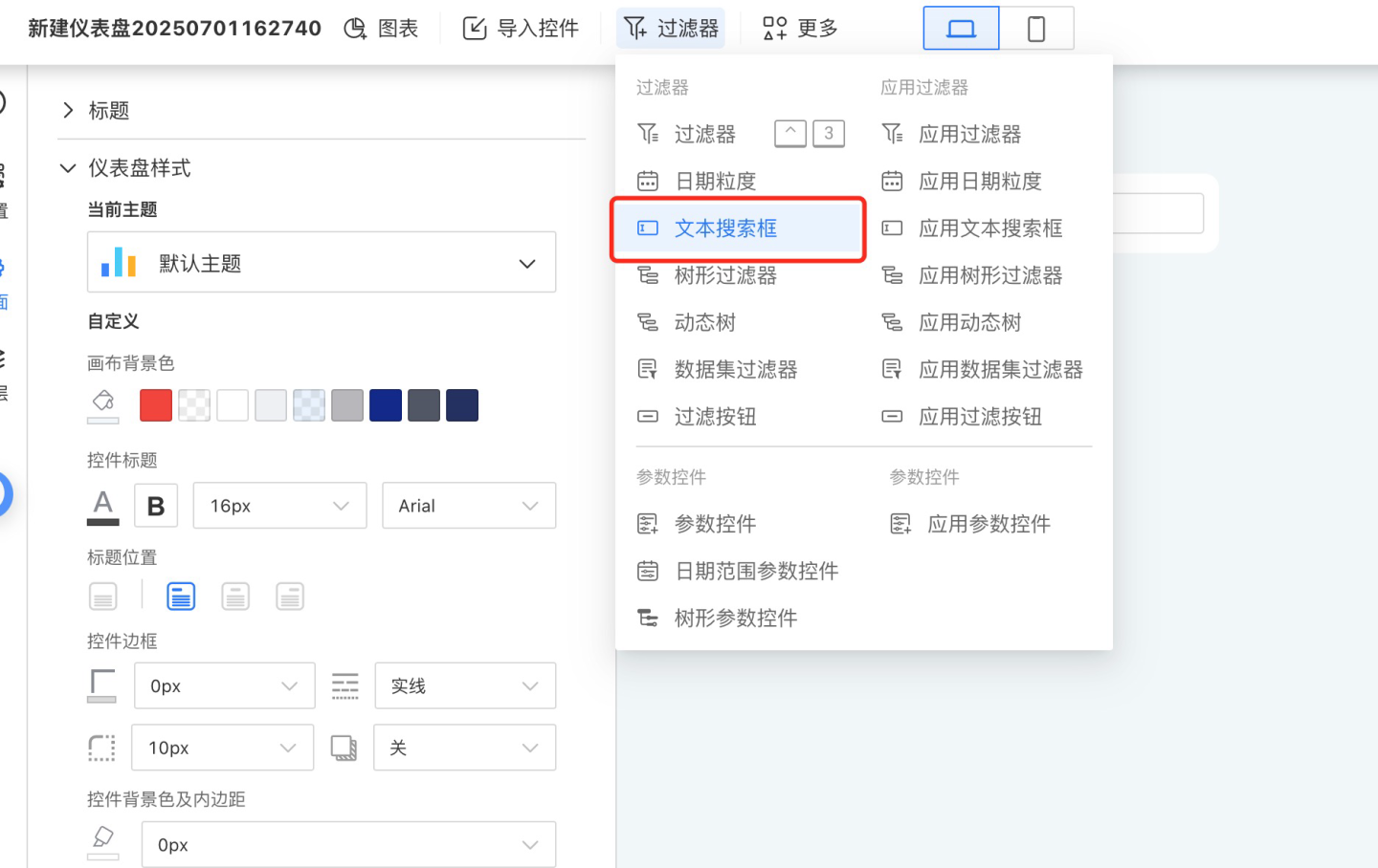 在仪表盘中添加文本搜索框。 1.在仪表盘中,点击新建过滤器->过滤器,创建一个新的过滤器,调整过滤器大小和位置。