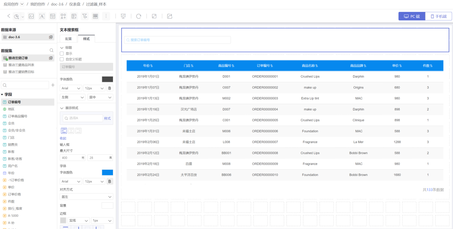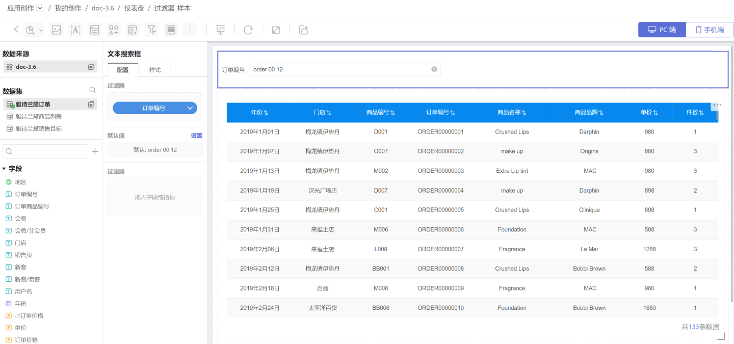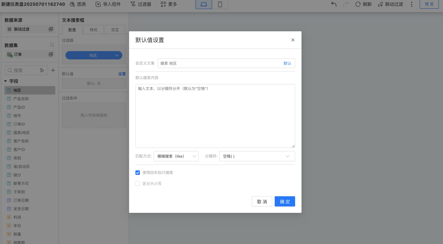 文本搜索框能够快速筛选出符合输入条件的数据,支持模糊搜索、精确搜索、以分隔符分别搜索等多种搜索方式。