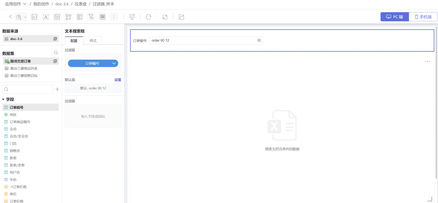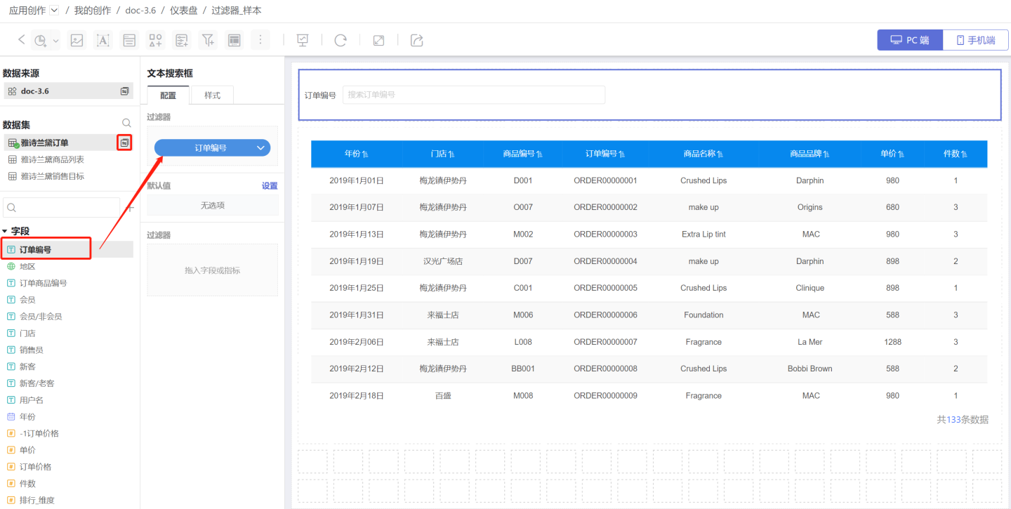 2.选择过滤字段所在的数据集,然后拖入需要筛选的字段。