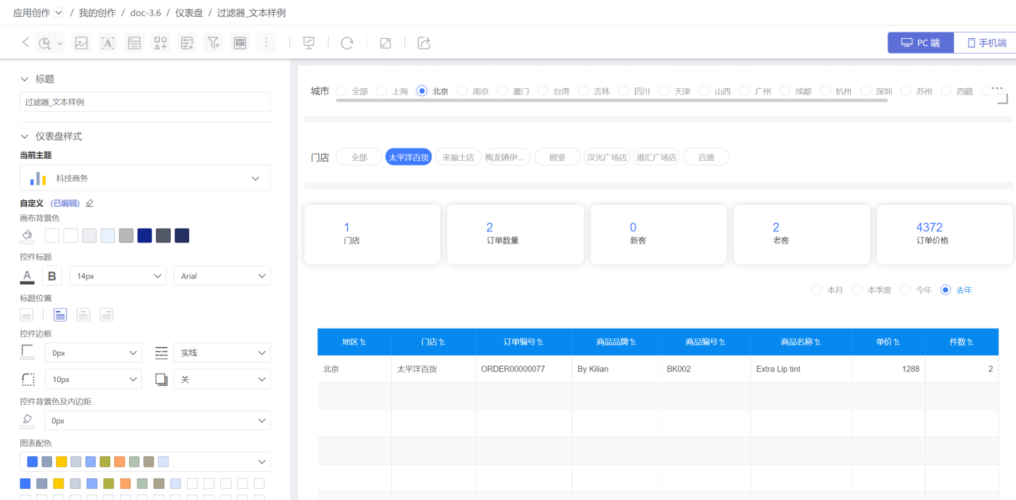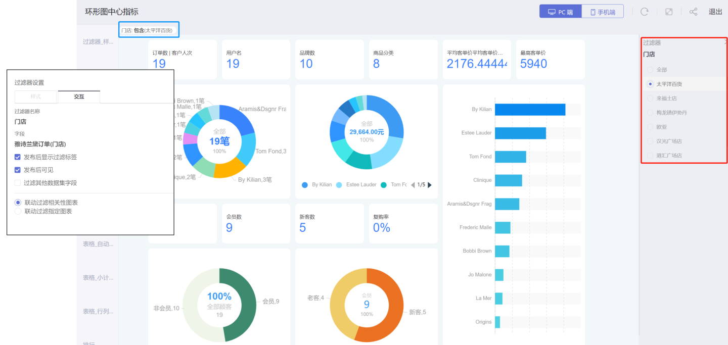 当仪表盘中有多个过滤器时,筛选某一个过滤器的时候,希望相关的过滤器也可以随之变化,实现过滤器之间联动。如示例中城市选择北京时,希望在门店中仅展示北京的门店信息。