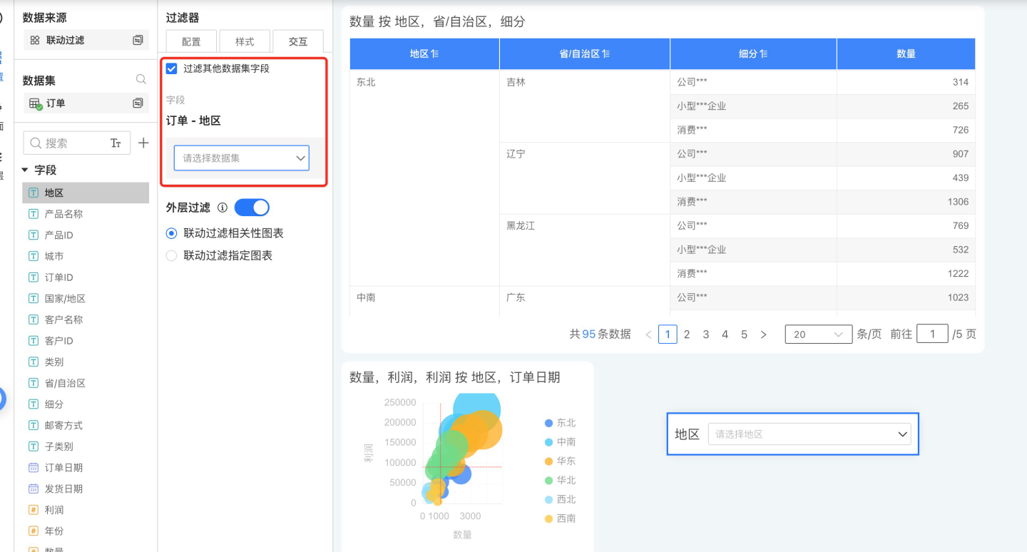 过滤其他数据集字段是指将当前过滤器字段值与其他数据集字段进行关联。当过滤器选项变化时,设置的其他数据集字段的图表也会跟随过滤选项而联动,如图所示,设置联动后,红色框中的图表会随过滤器进行联动。