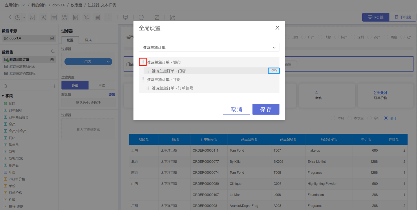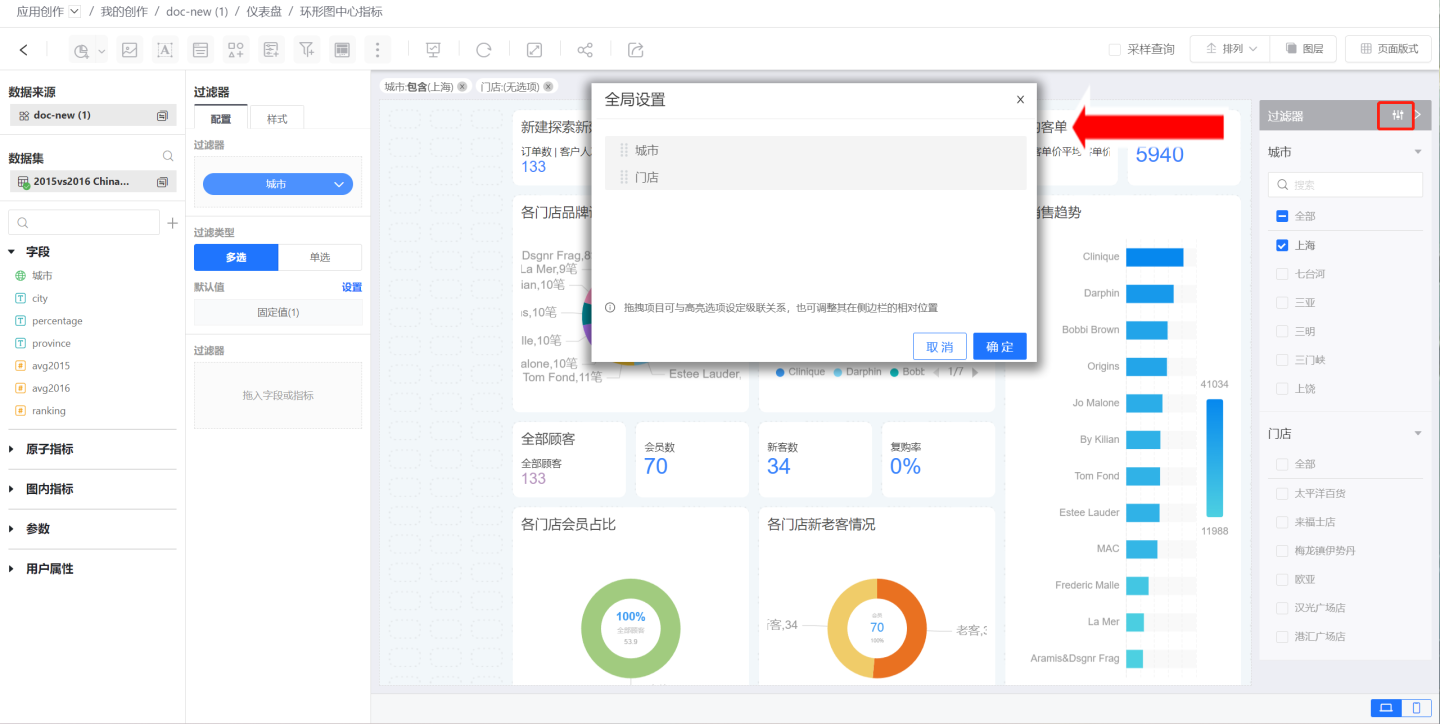 全局设置可以调整过滤器的层级关系实现过滤器关联。点击过滤器的三点菜单中的全局设置,在弹框中展示了该过滤器能够进行层级调整的所有过滤器,通过红色按钮调整上下位置,通过蓝色按钮调整层级。