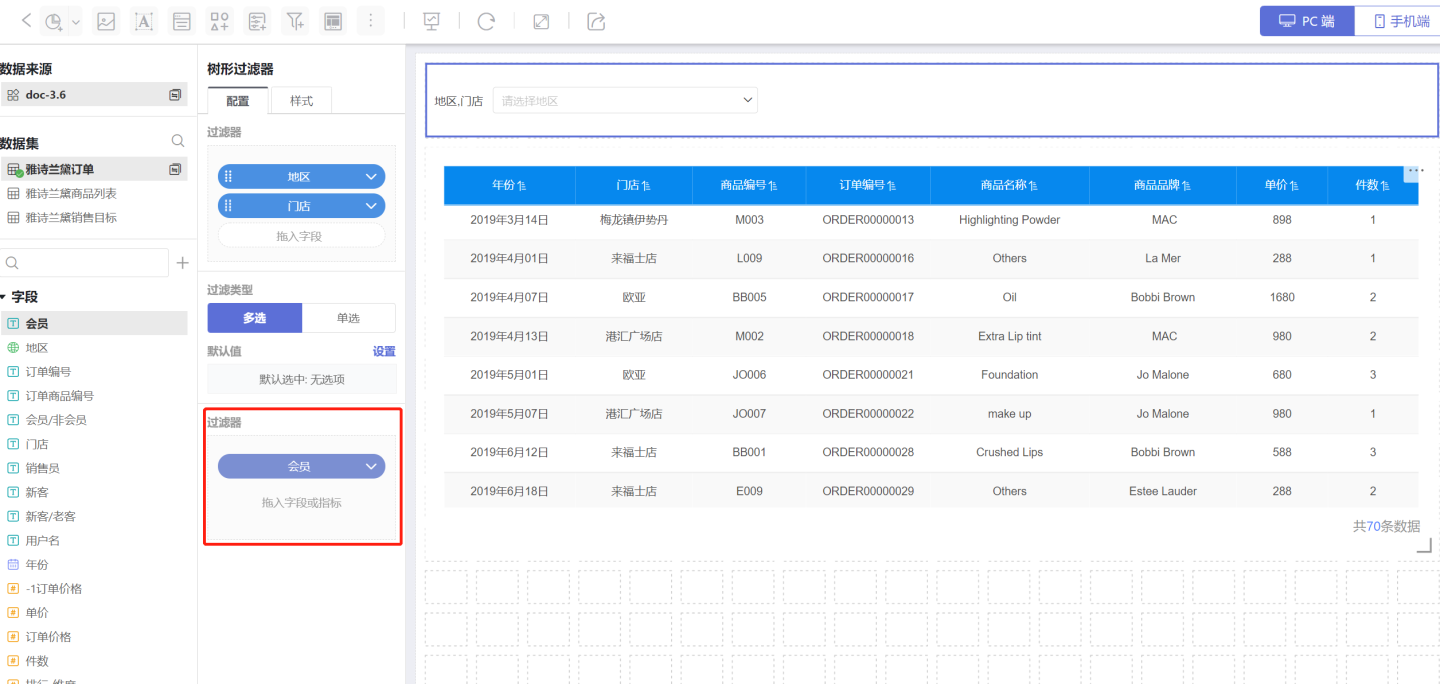 树形过滤器包含多个过滤字段,所以树形过滤器设置过滤其他数据集字段时,需要首先选择相应的过滤字段。
